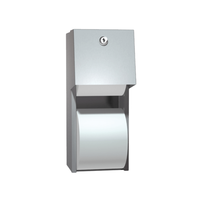 Peut contenir deux rouleaux jusqu'à 5 1/4″ (133 mm) de diamètre (1800 feuilles). Le rouleau supérieur se met automatiquement en place lorsque le rouleau inférieur est épuisé. Armoire et mécanisme en acier inoxydable de type 304. Broches antivol.