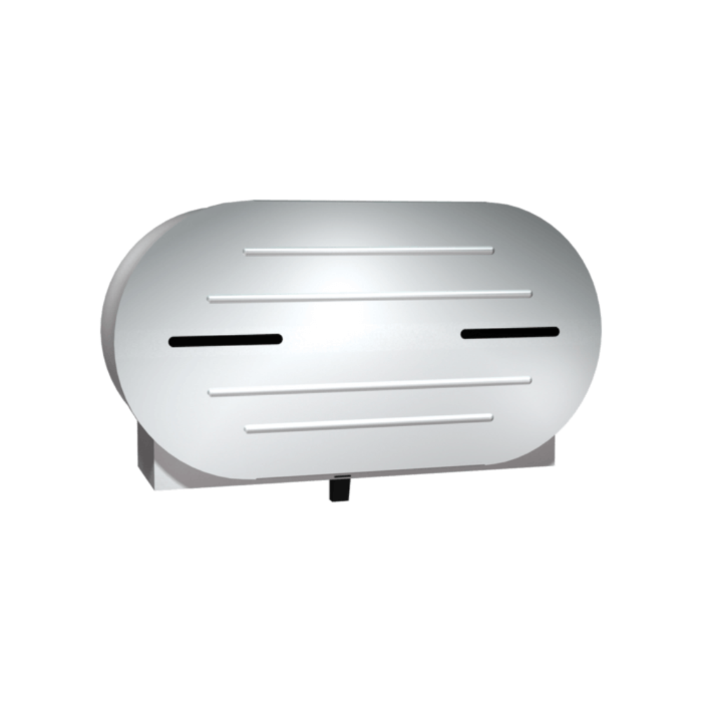 Contient deux rouleaux de 9″ (229 mm) de diamètre de 2-1⁄4″ ou 3″ (57 ou 76 mm). Lorsqu'un rouleau est épuisé, faire glisser le panneau pour exposer l'autre rouleau. La porte et la plaque de montage sont fabriquées en acier inoxydable 304 de calibre 18, avec une finition satinée. Deux fentes d'inspection permettent de voir les rouleaux de papier hygiénique à l'intérieur. Équipé d'une serrure à gorges.