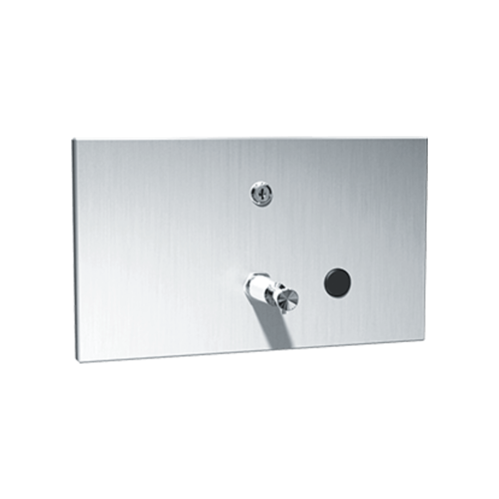 En acier inoxydable avec finition satinée, valve à savon tout usage, d'une capacité de 57 fl. oz. (1.7 L) de savon liquide, lotion ou détergent, de détergents synthétiques et de savons antibactériens. Le contenu doit être distribué à partir d'un robinet à bouton-poussoir de type tige. Le fonctionnement du robinet est conforme aux normes ADAAG et ICC/ANSI A-117.1 en permettant de l'actionner avec une force inférieure à 5 lbsf (22,2N) nécessitant une (1) seule main et sans qu'il soit nécessaire de saisir, de pincer ou de tordre le poignet.
