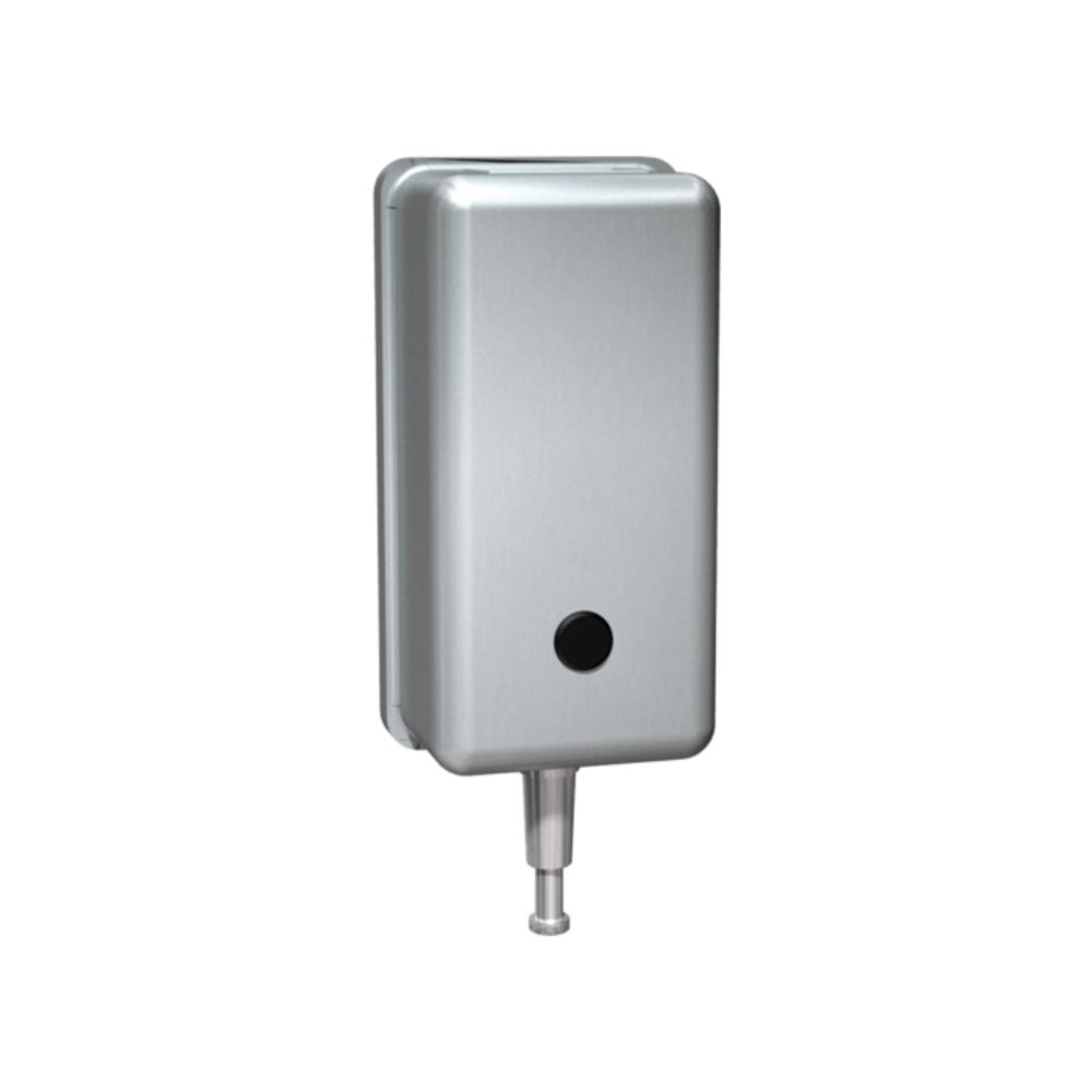 Distributeur de savon d'une capacité de 1,1 L (40 fl. oz.) en acier inoxydable satiné. Il est équipé d'une valve universelle montée verticalement depuis le bas du conteneur pour une utilisation dans les douches et d'un indicateur de remplissage inviolable.