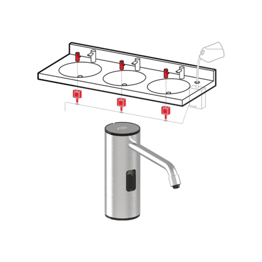 Gagnez du temps et ménagez vos genoux avec le tout nouveau système de distribution de savon Top Fill Multi-Feed d'ASI. Remplissez jusqu'à 12 distributeurs automatiques de savon liquide ou en mousse en une seule fois grâce à l'orifice de remplissage du comptoir relié à un réservoir étanche de grande capacité - un ajout parfait à toute salle de bains à forte fréquentation.