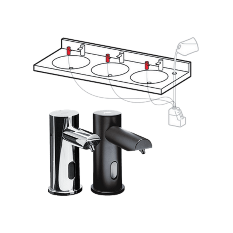 Il est composé d'un bec chromé et d'un boîtier de détection mains libres fonctionnant sur batterie ou sur secteur, avec une finition hautement polie sur toutes les surfaces. La LED indique la fonction et l'état de la batterie sur la face avant. L'alimentation en savon doit se faire par l'orifice de remplissage supérieur EZ Fill™ monté sur le meuble et le réservoir à alimentation multiple (fournis séparément).