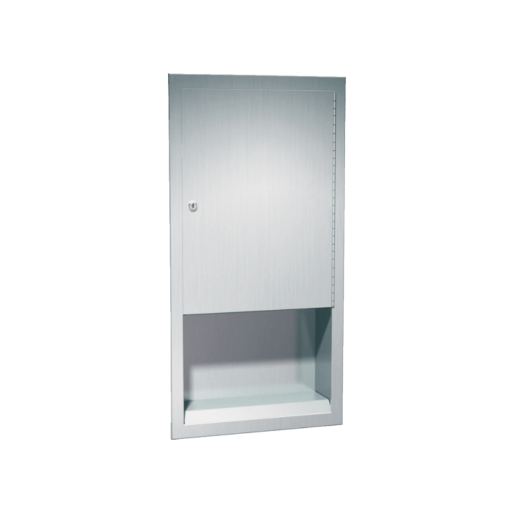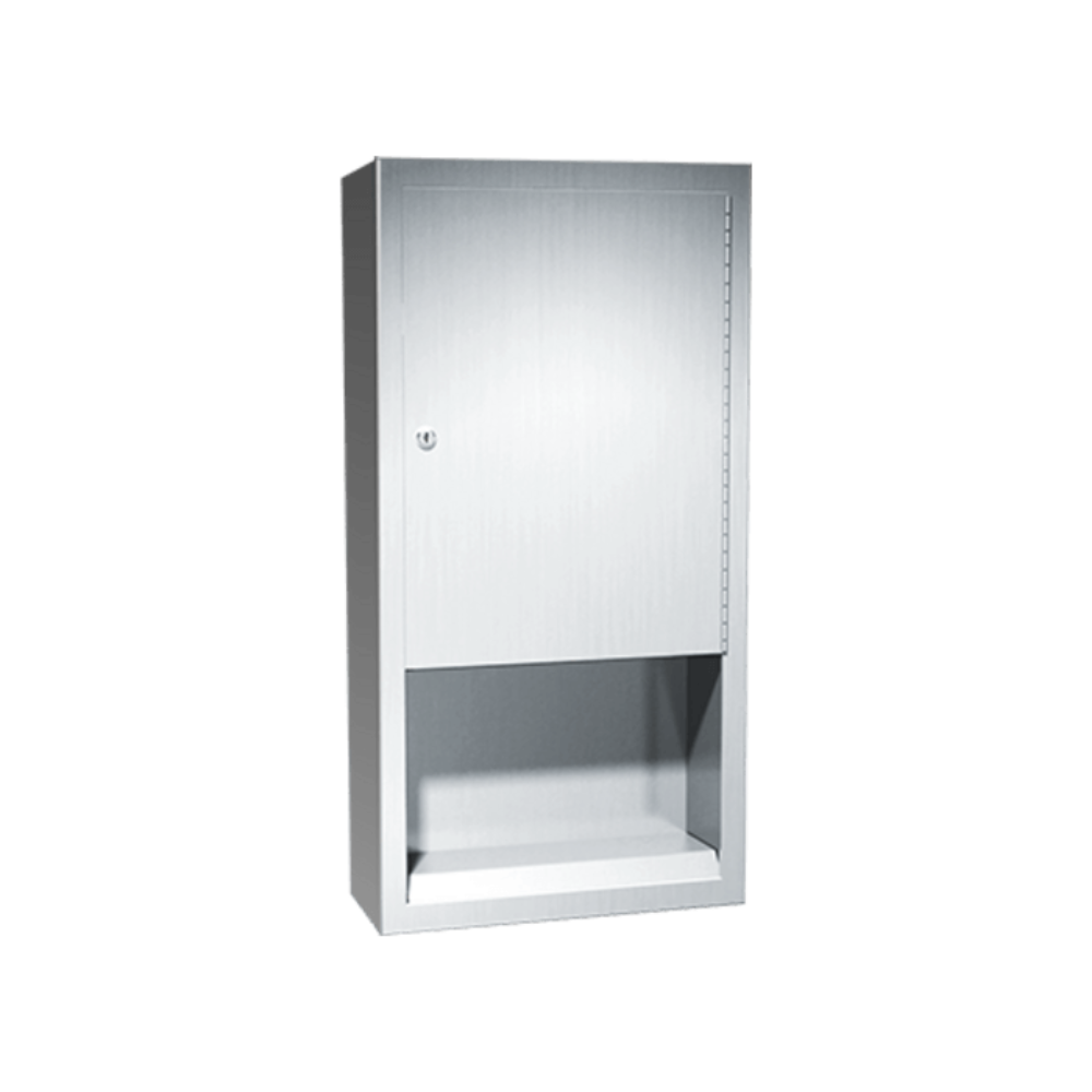 Distribue 600 serviettes en papier à plis en C ou 800 serviettes en papier à plis multiples. Les serviettes s'alimentent d'elles-mêmes jusqu'à épuisement de la réserve. L'appareil peut être rechargé avec une charge partielle en place et continuera à s'alimenter correctement. La porte est maintenue fermée par une serrure à gorges.