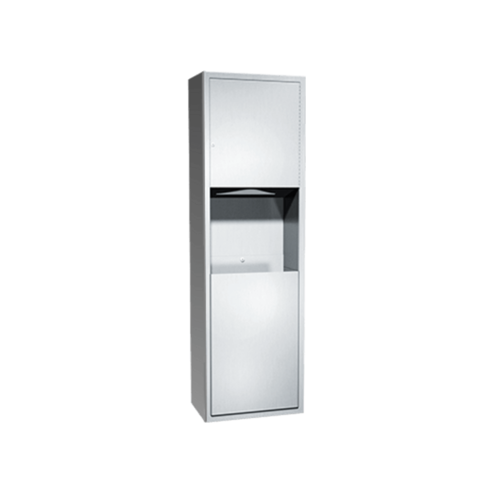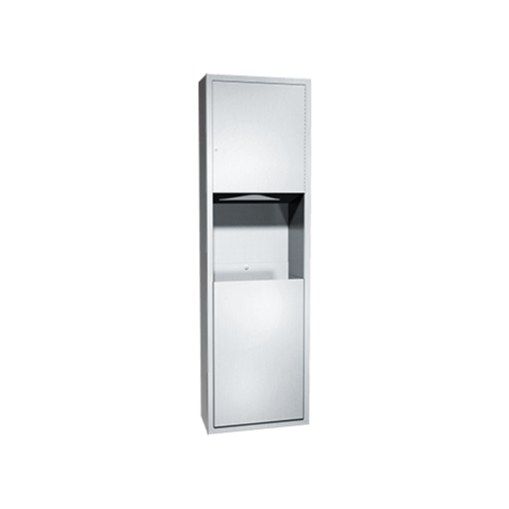 Distribue 600 serviettes en C, 800 serviettes multiples ou 1100 serviettes simples. Récipient à déchets en acier inoxydable de 46 ou 68 litres (12 ou 18 gal.). Un guide réglable est fourni pour permettre la distribution d'essuie-tout à plis multiples ou à plis en C.