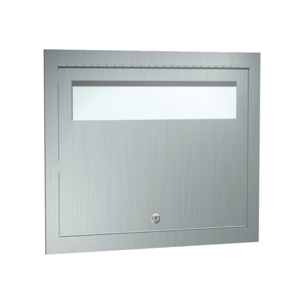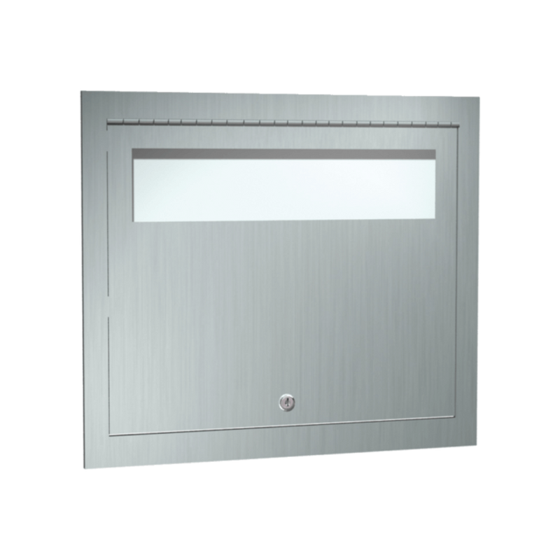 Modèle Encastré: Distribue 500 couvertures de siège de toilette en papier standard, simples ou demi-pliées, contenues dans la boîte de fournitures. La porte à charnière piano en acier inoxydable à plusieurs points d'ancrage comprend une serrure à gorges.