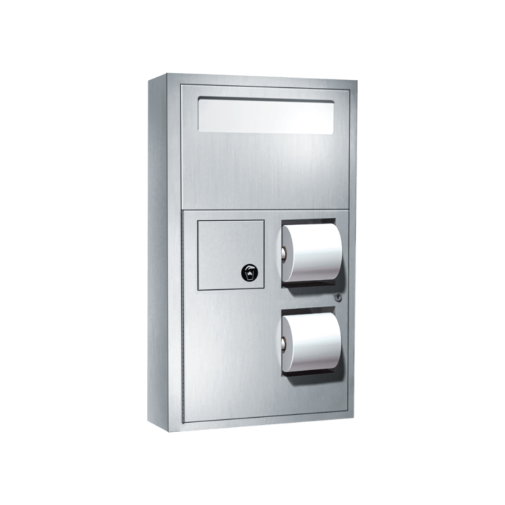 Peut contenir et distribuer 1000 housses de siège en papier et deux (2) rouleaux de papier hygiénique standard ou 1800 feuilles de 4-1/2″ x 5-1/4″ de diamètre (114 x Ø133). Capacité de déchets de 300 pouces cubes (.005m3 ) ou 1,3 gal (4,9 litres). Comprend un collier en acier inoxydable pour le montage en surface.