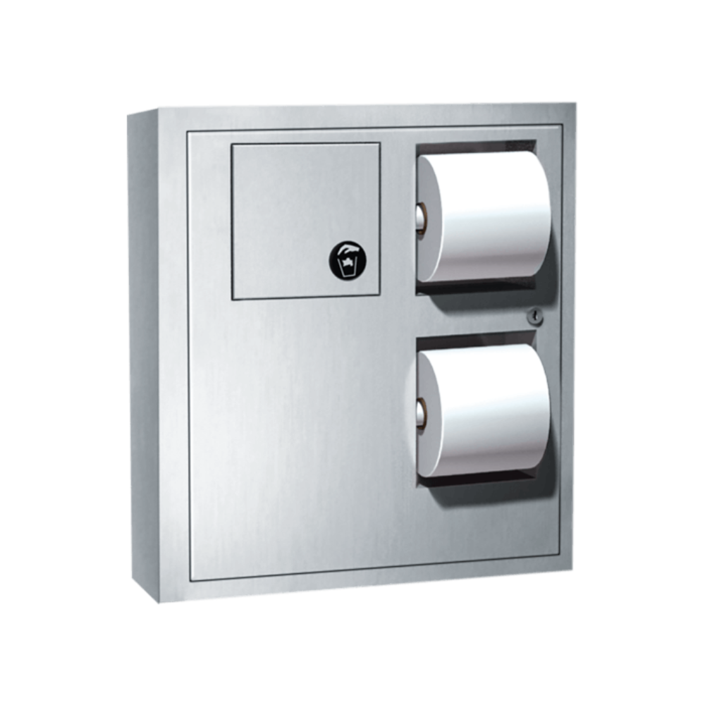 Peut contenir et distribuer deux (2) rouleaux de papier toilette standard ou 1800 feuilles de 4-1/2″ x 5-1/4″ de diamètre (114 x Ø133). Capacité de déchets de 300 pouces cubes (.005m3 ) ou 1,3 gal (4,9 litres). Comprend un collier en acier inoxydable pour le montage en surface.