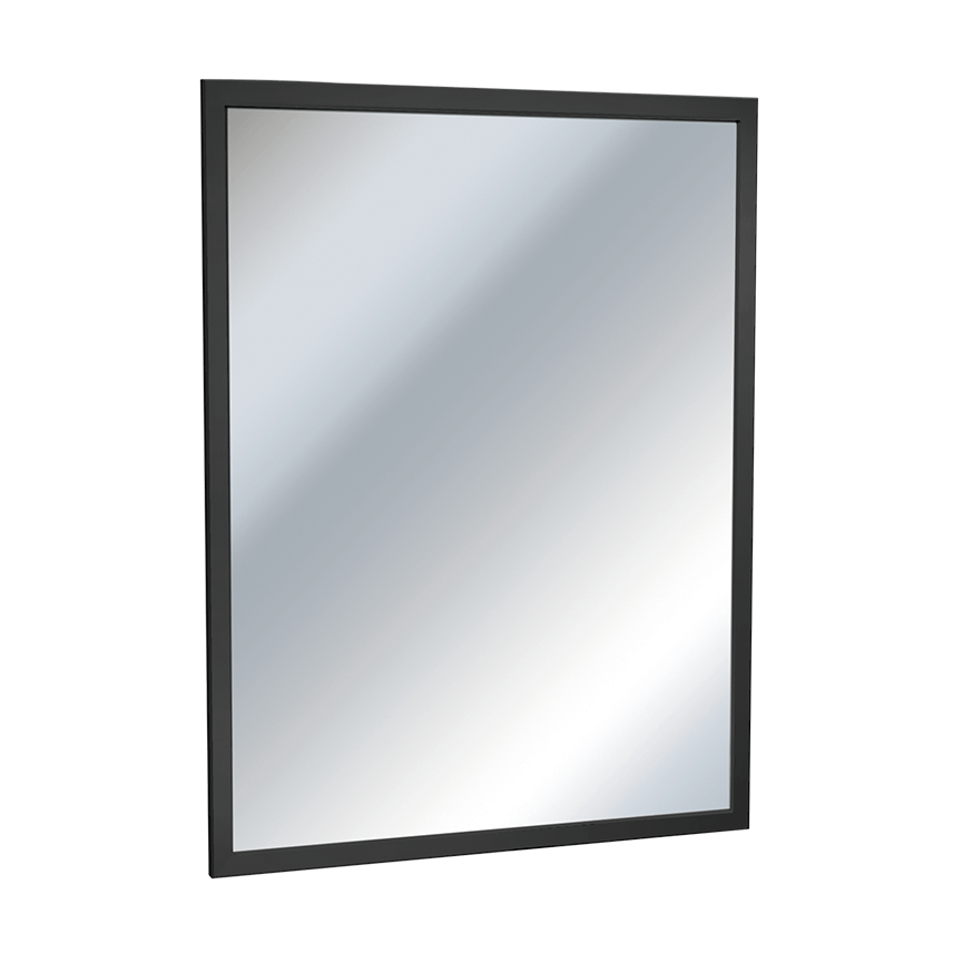 3⁄4″ x 5⁄8″ (19 x 16 mm) en acier inoxydable 304 de calibre 18, dont les coins ont été soudés à l'héliarc, meulés et polis. Le miroir est installé sur un support de suspension dissimulé qui se verrouille en haut et en bas du cadre à l'aide de vis de blocage inviolables. La plaque arrière est d'une seule pièce, fixée au cadre par un dispositif de verrouillage antivol.