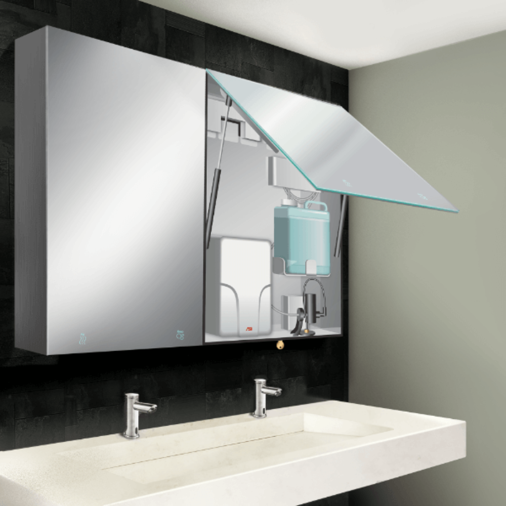 Le Velare™ Behind the Mirror (BTM) d'ASI est conçu dans un souci d'élégance et de sécurité, dissimulant les consommables dans une armoire en acier inoxydable de type 304. L'armoire comporte une porte en miroir avec des icônes rétroéclairées qui indiquent les fonctions fournies à partir du panneau inférieur de chaque module. Le miroir est en verre trempé sans cadre de 6 mm d'épaisseur, conforme à la norme ASTM C-1048, avec des bords en crayon et des coins arrondis, un renfort intermédiaire en acier inoxydable et une plaque arrière en acier inoxydable avec des supports soudés intégrés, une charnière et une serrure.