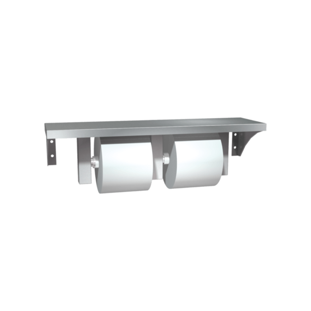 Contient deux (2) 5′′ (127 mm) dia. rouleaux de 1500 feuilles ou rouleaux de papier toilette standard et comprend une étagère en acier inoxydable de 5″ x 18″ (127 mm x 457 mm) avec un rebord ourlé de 5/8″ (16 mm) sur le bord avant. Les roulettes sont moulées en plastique polystyrène résistant aux chocs et deux (2) sont fournies.