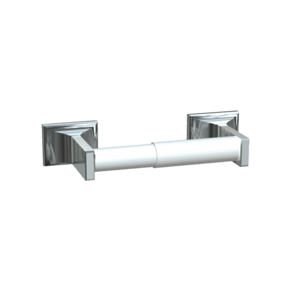 Fabriqué en zamak triple chromé résistant à la rouille. Le rouleau maintient et distribue tous les rouleaux de papier hygiénique standard jusqu'à 5″ de diamètre (Ø127). Le rouleau est en plastique avec un ressort interne pour la tension et est amovible des supports pour faciliter le chargement.
