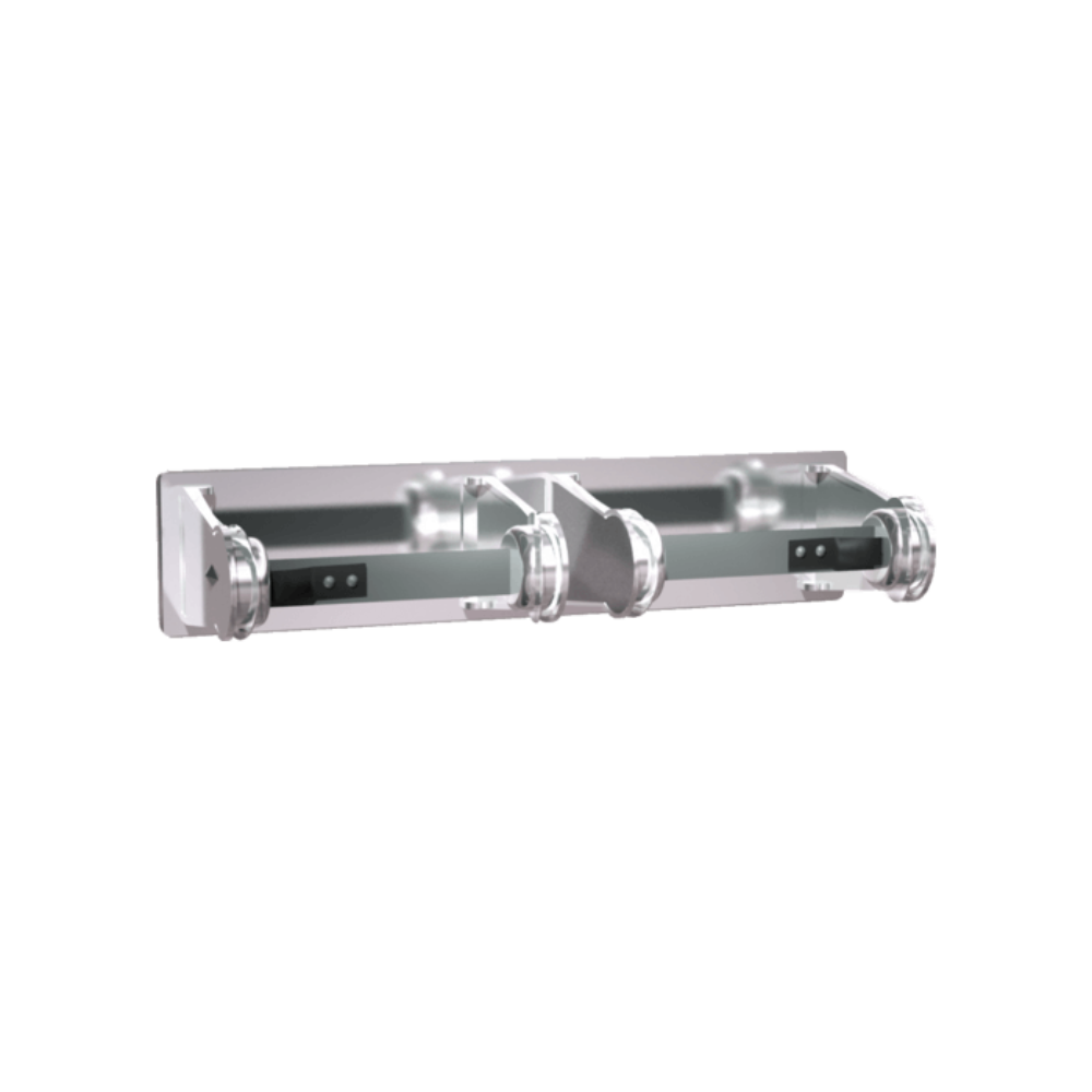 Contient deux (2) rouleaux de papier hygiénique standard jusqu'à 6″ de diamètre (Ø152) et 4-1/8″ à 4-3/4″ (105-121) de large. L'unité est fabriquée en acier chromé poli. Les ressorts de freinage assurent une distribution contrôlée pour chaque rouleau de papier hygiénique. Le noyau du rouleau empêche l'accès au ressort de déclenchement et le rouleau doit être inamovible jusqu'à ce qu'il soit épuisé.