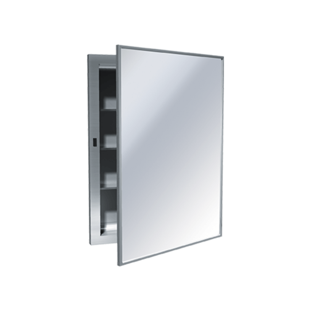 Le cadre du miroir à porte battante est fabriqué en acier inoxydable de type 304 avec une finition satinée. Le miroir a une épaisseur de 1/4 po (6 mm) et est garanti pendant 15 ans contre la détérioration de l’argenture. La porte est munie d’une charnière piano pleine longueur et d’un loquet magnétique. L’armoire comprend trois étagères amovibles en acier inoxydable.