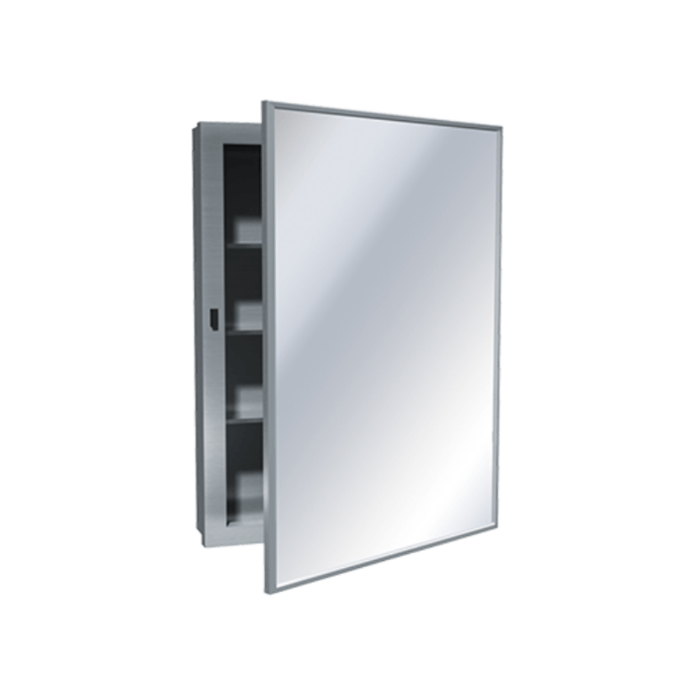 L'armoire montée en surface est fabriquée en acier inoxydable de calibre 20 avec une finition satinée. La porte en miroir est suspendue à l'armoire par une charnière piano de 3/16″ sur toute la longueur. L'armoire comporte trois étagères réglables en acier inoxydable.