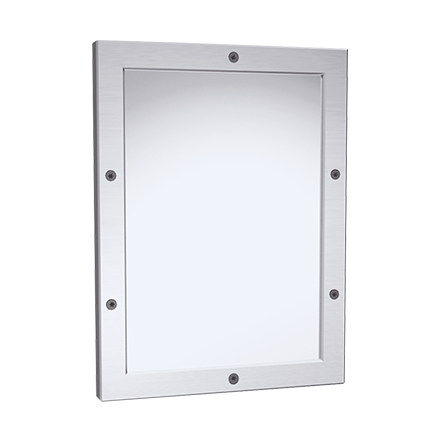 Cadre en acier inoxydable de type 304 de calibre 14 avec finition satinée, coins soudés et meulés. Le montage frontal est fourni avec des vis Torx® anti-vandalisme 1⁄4-20″ x 2 (150 mm).