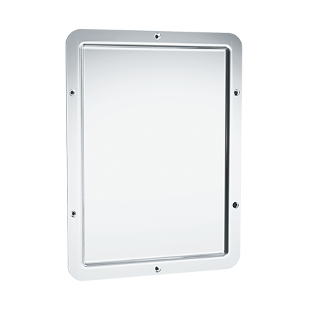 Miroir formé d'une seule pièce en acier inoxydable 304 de calibre 18 avec finition polie miroir #8, cadre intégral, coins arrondis et 6 trous de fixation.