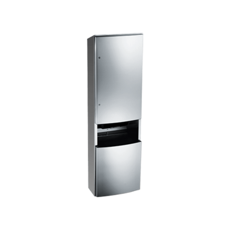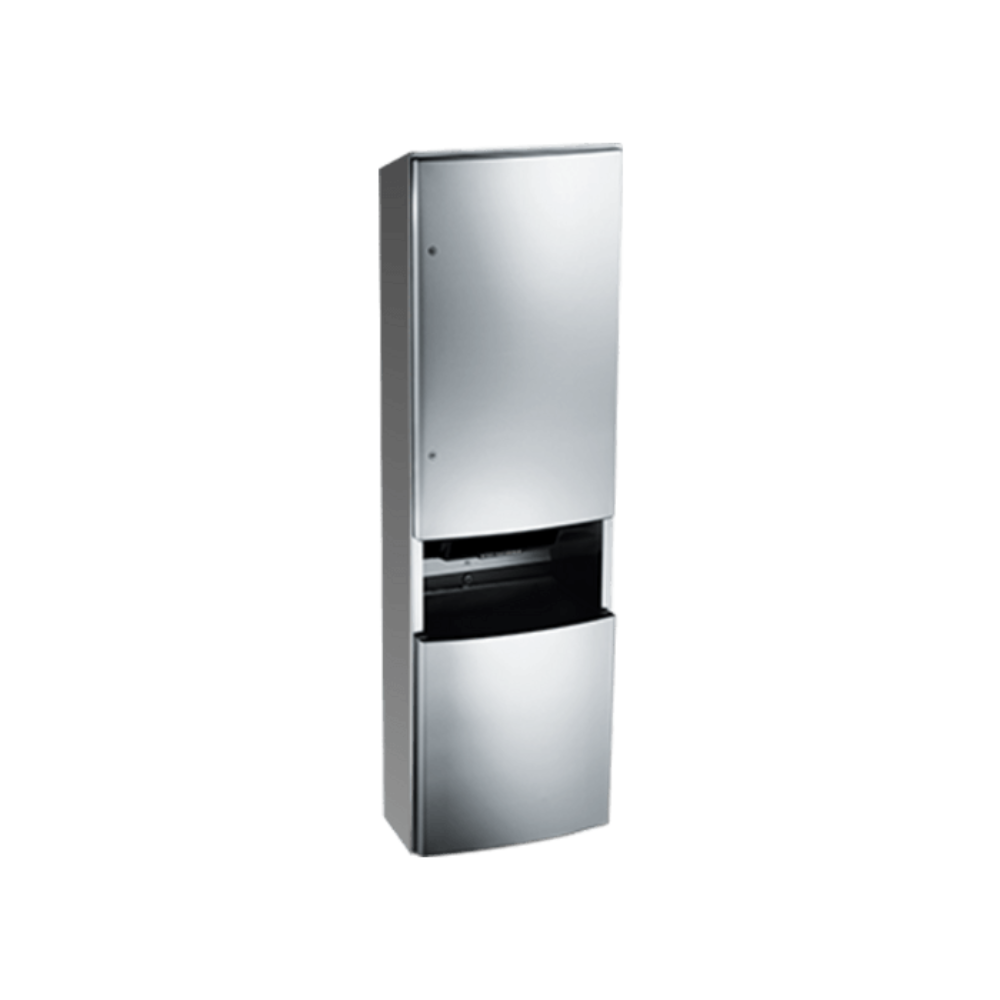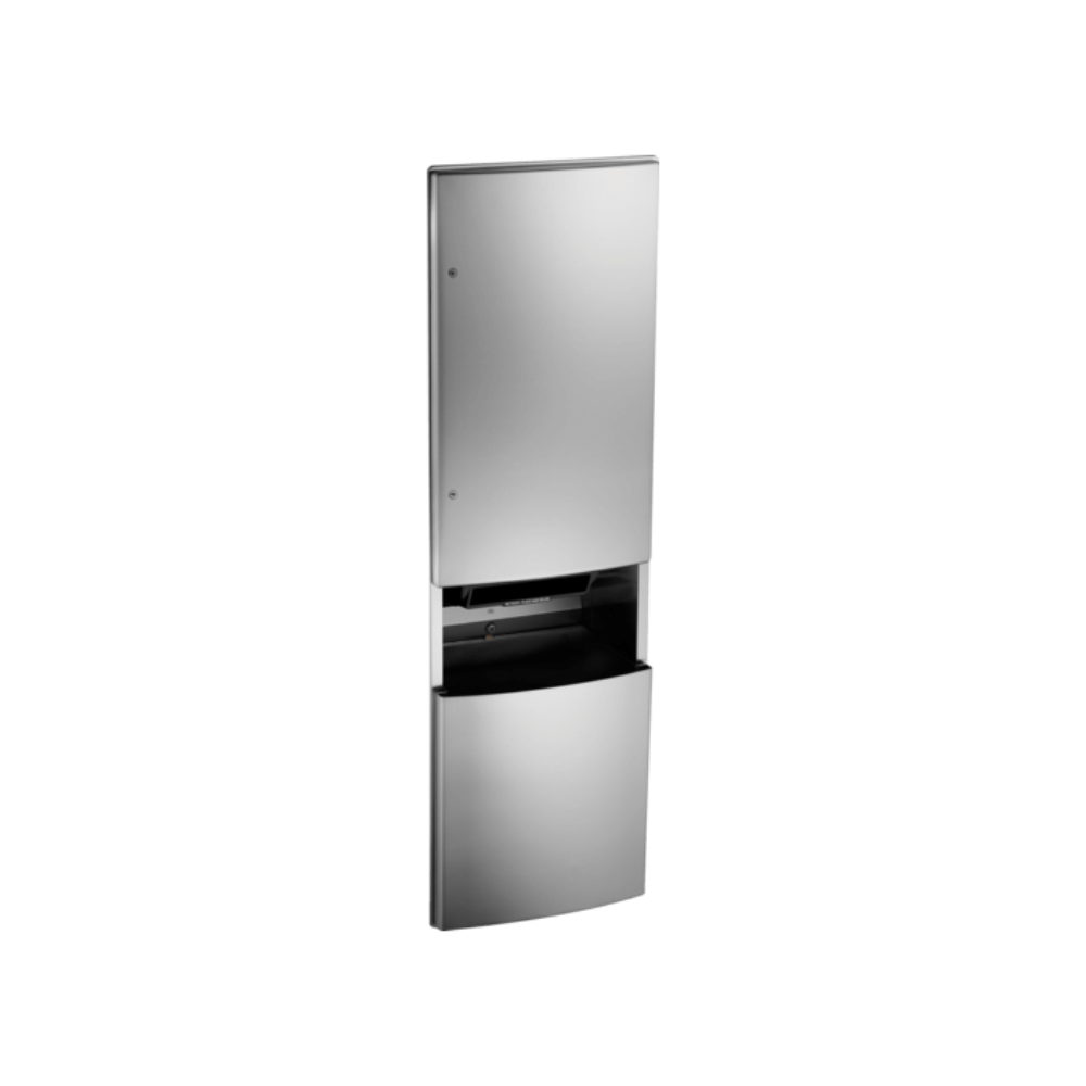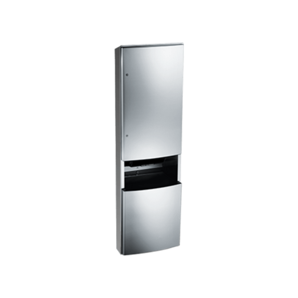 L'unité sans contact à détection de proximité distribue une longueur prédéfinie par cycle à partir d'un rouleau d'essuie-mains standard de 8" ou 9" de large jusqu'à 800 pieds (244 m) de long et a la capacité de distribuer un rouleau en bout pour une distribution continue. Le réceptacle à déchets plus petit, 13,5 gal. (51,1 L), permet à l'unité d'être conforme aux normes ADA. L'étagère interne est idéale pour le stockage des serviettes en papier. La longueur de l'essuie-mains est déterminée par le propriétaire en réglant les interrupteurs de longueur, de délai et d'économie de papier.