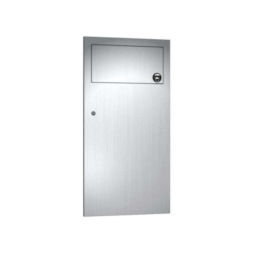 Poubelle en acier inoxydable d’une capacité de 4 gal. (15 L) avec un panneau auto‑fermant qui couvre son ouverture. La porte de l’armoire se verrouille à l’aide d’une serrure à barillet. Le conteneur à déchets est fabriqué en acier résistant à la corrosion, robuste, avec une poignée pour une manipulation facile.