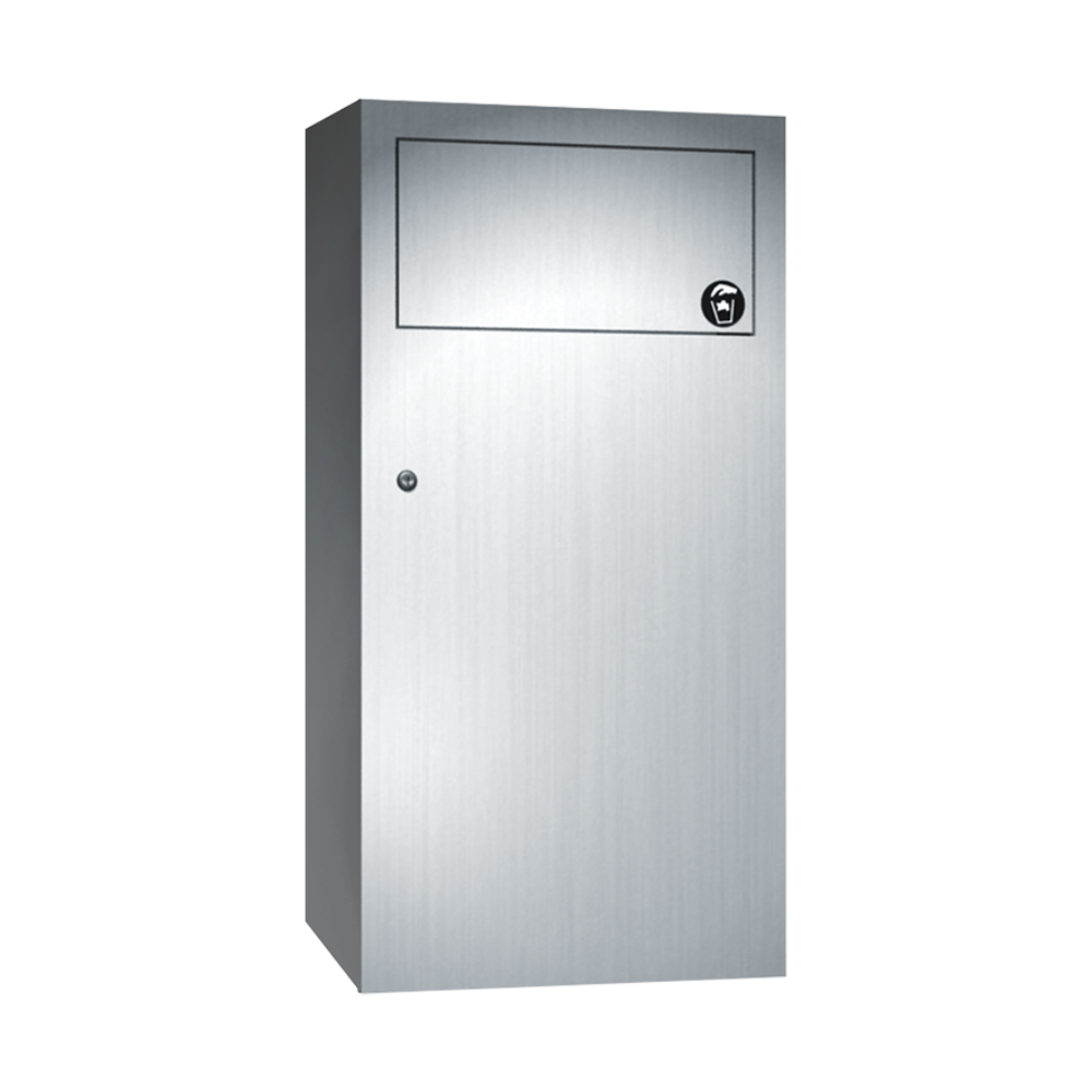 Les déchets sont déposés par la porte à pression auto‑fermante. Le compartiment verrouillé empêche tout accès non autorisé. La porte avant complète est formée d’une seule pièce d’acier inoxydable type 304, alliage 18-8, calibre 18. L’armoire est fabriquée en acier inoxydable du même type, calibre 20, sans dispositifs de fixation apparents ni soudures ponctuelles.