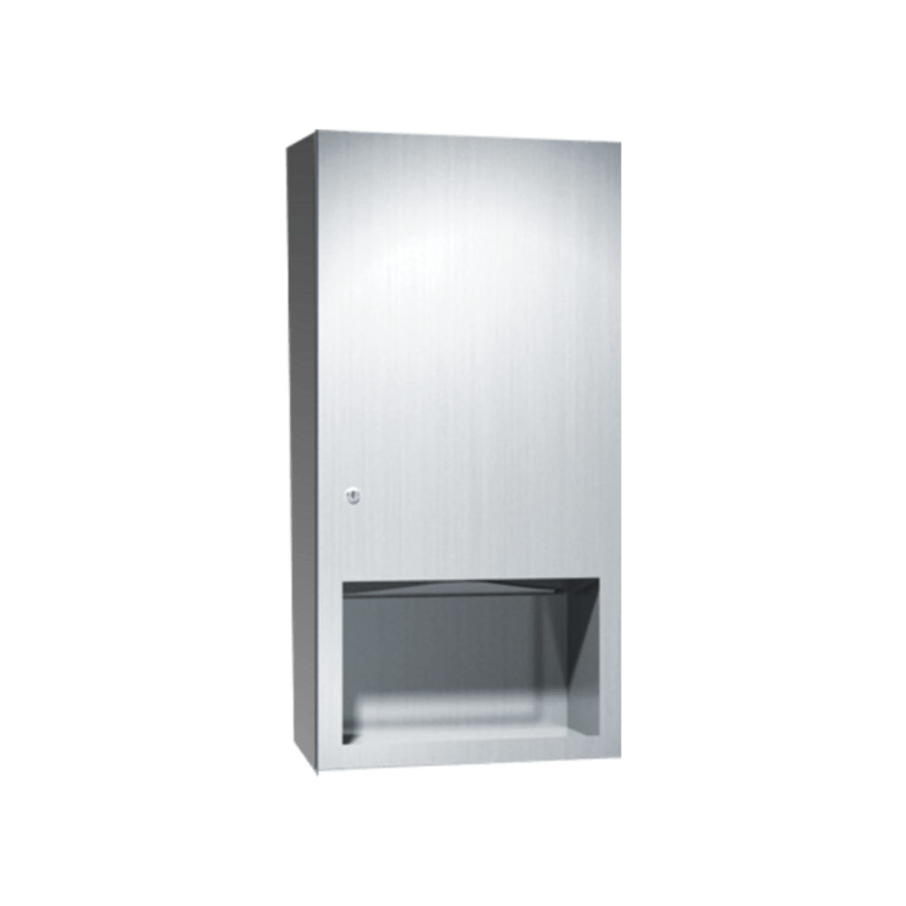 Peut contenir et distribuer 600 serviettes en papier à plis en C ou 800 serviettes en papier à plis multiples. La porte est maintenue fermée par une serrure à gorges. Toutes les surfaces exposées ont une finition satinée No 4.