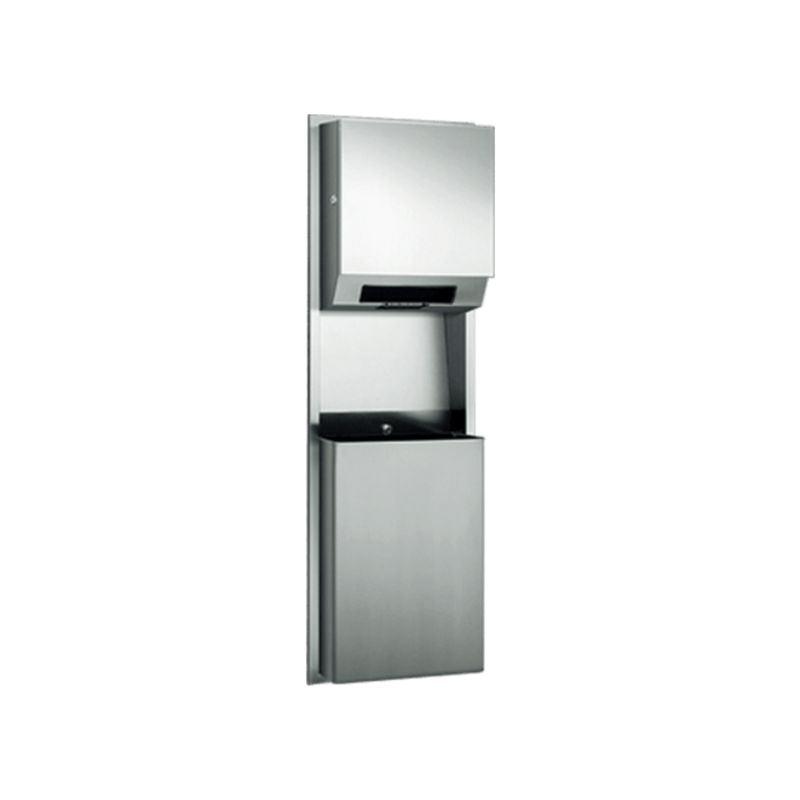 L'unité encastrée à détection de proximité et sans contact distribue une longueur prédéfinie par cycle à partir de rouleaux de 8″ ou 9″ (205 ou 230 mm) de large et de 800 pieds (244 mm) de long. Récipient à déchets de 45,4 L (12 gal.).