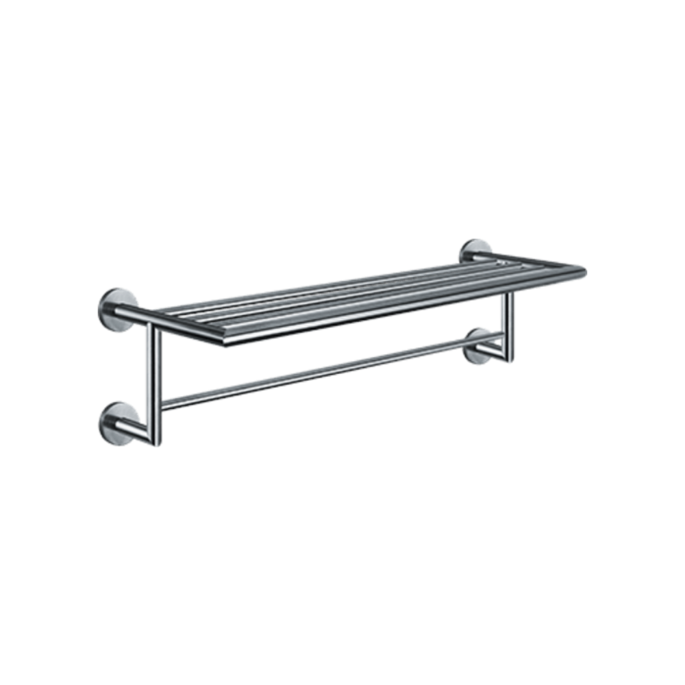 L'étagère comporte des espaces ouverts entre les tubes pour réduire le poids et faciliter le séchage. Une étagère correctement installée peut supporter jusqu'à 35,3 lb (16 kg) de poids total de serviettes et d'articles suspendus à la tringle. Unité robuste avec des tubes de 3/4″ de diamètre en acier inoxydable de type 304. Une vis de blocage en acier inoxydable est fournie sur le périmètre inférieur des brides pour verrouiller l'unité aux plaques de montage.