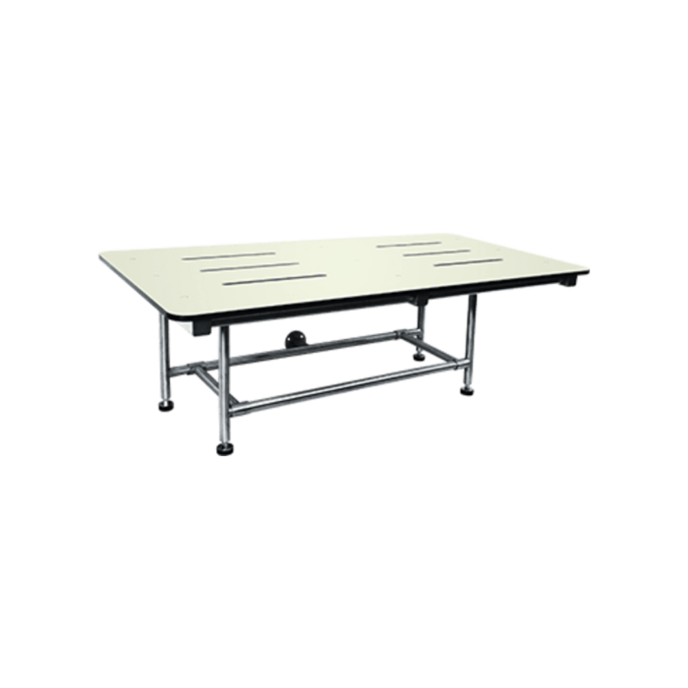 Le siège est en phénolique blanc, avec une âme noire. Le cadre, le support de montage et le crochet de retenue sont en acier inoxydable 304 satiné. Le siège a une profondeur de 22-1/2″ (572 mm) et une largeur de 48″ (1219 mm), dépassant de 24″ (610 mm) du mur en position ouverte. Lorsqu'ils sont rétractés, les pieds se replient pour offrir un profil bas contre le mur.