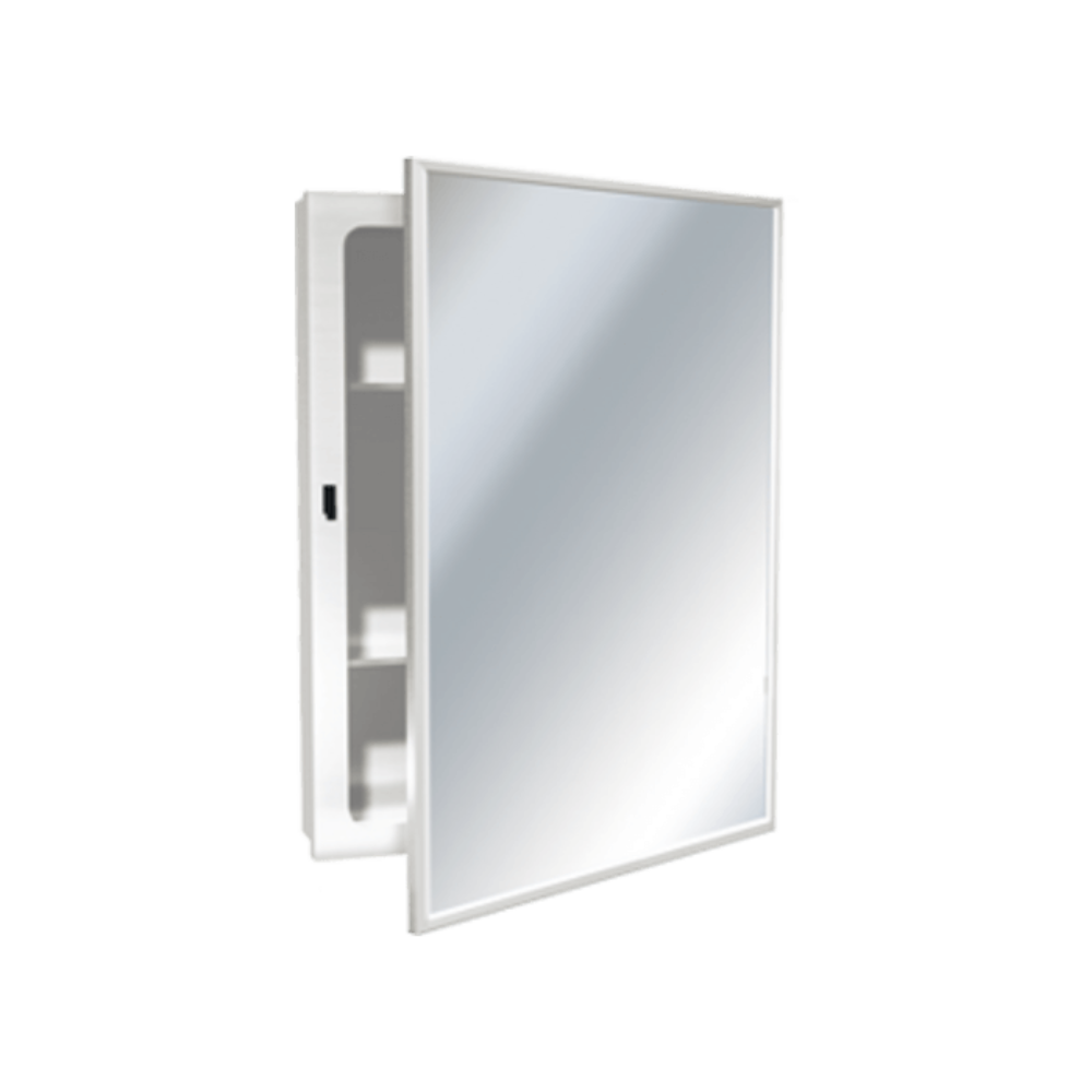 Monobloc, en acier étiré laminé à froid, avec finition en acier revêtu de poudre blanche. Porte miroir à cadre en acier inoxydable avec plaque de verre de 6 mm d'épaisseur, avec charnière piano continue et fermeture magnétique. Deux étagères réglables en acier émaillé blanc.