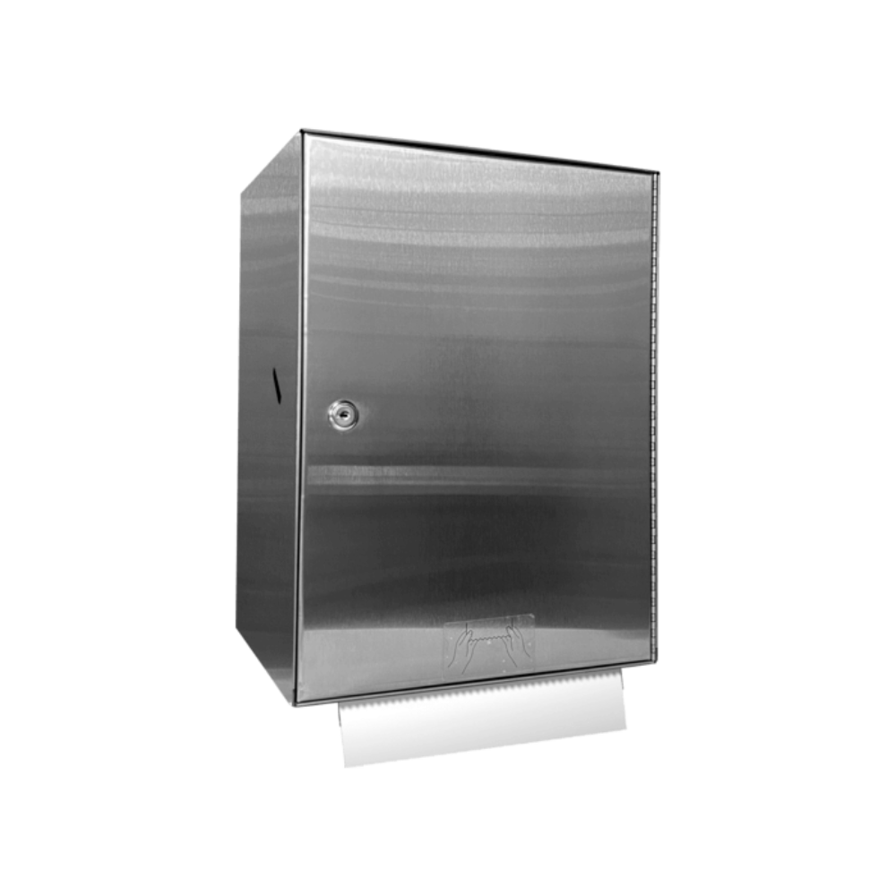 Contient un rouleau d'essuie-mains standard de 8" x 8" (203 x 203 mm) et un rouleau de 3" de diamètre (Ø76 mm) et distribue un essuie-mains coupé sur toute la largeur de 12" (305) de long à partir d'un distributeur automatique d'essuie-mains. L'unité passe automatiquement d'un rouleau épuisé à un nouveau rouleau sans interruption. Fabriqué en acier inoxydable de type 304 et finition satinée. Equipé d'une serrure à gorges et d'une charnière à piano en acier inoxydable à plusieurs points d'ancrage. Les bords de l'armoire sont ourlés pour plus de sécurité.