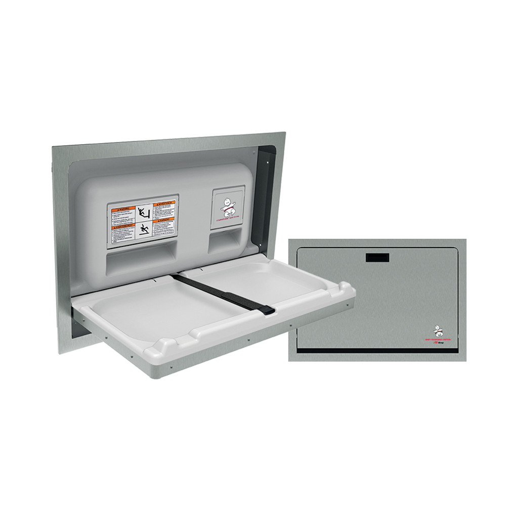 L'unité conforme aux normes ADA est en acier inoxydable soudé pour une utilisation durable et fiable. Les surfaces exposées sont satinées. Une poignée de traction et un ressort dissimulé permettent de l'ouvrir d'une seule main. Le plan à langer est en plastique résistant aux chocs pour un nettoyage facile. Doté d'une sangle de sécurité réglable en deux parties, destiné aux nourrissons jusqu'à 3,5 ans et d'une capacité de charge de 23 kg (50 lb), ce produit assure la protection des enfants.