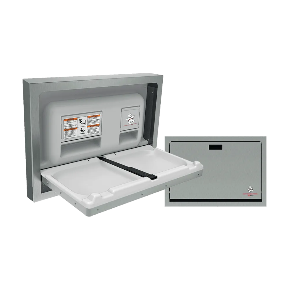 L'unité conforme aux normes ADA est en acier inoxydable soudé pour une utilisation durable et fiable. Les surfaces exposées sont satinées. Une poignée de traction et un ressort dissimulé permettent de l'ouvrir d'une seule main. Le plan à langer est en plastique résistant aux chocs pour un nettoyage facile. Doté d'une sangle de sécurité réglable en deux parties, destiné aux nourrissons jusqu'à 3,5 ans et d'une capacité de charge de 23 kg (50 lb), ce produit assure la protection des enfants.