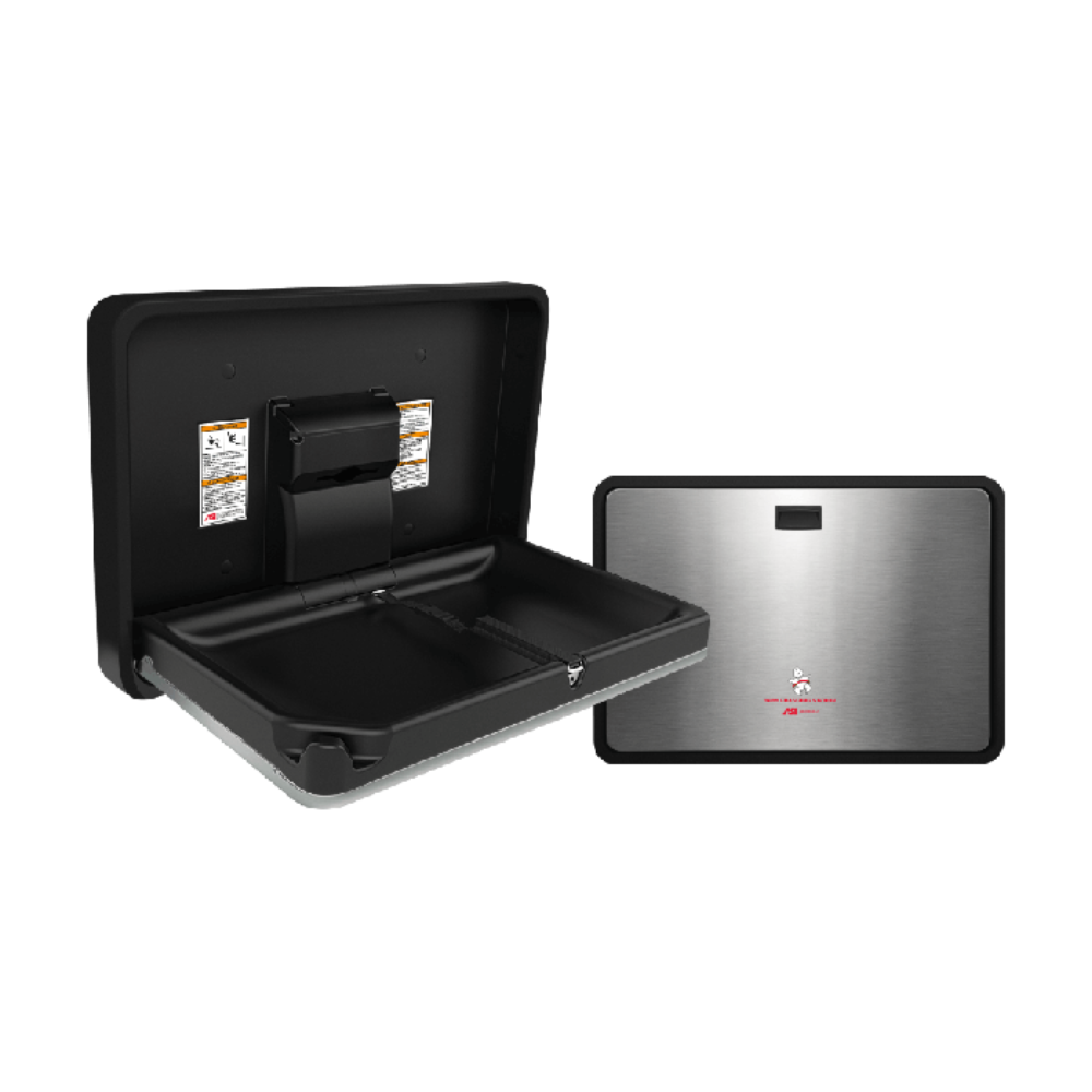 Table à langer, HORIZONTAL - PLASTIQUE NOIR MAT/ACIER INOXYDABLE (SATINÉ), montage en surface, capacité de 250 lbs