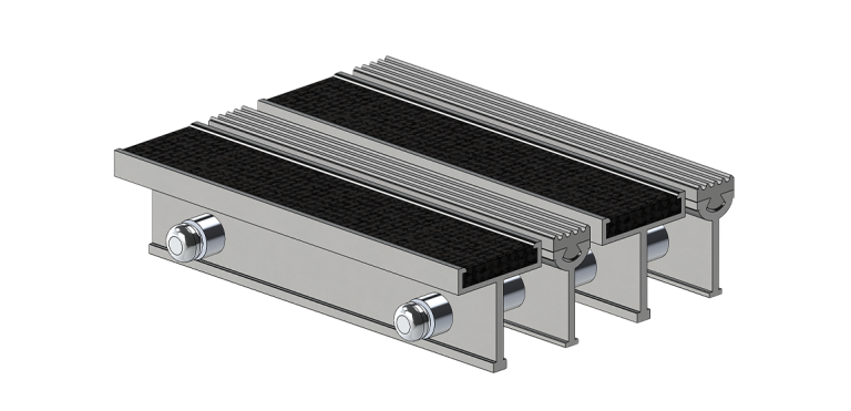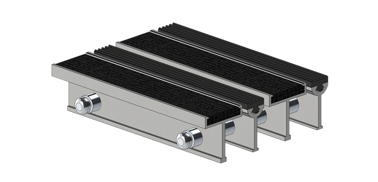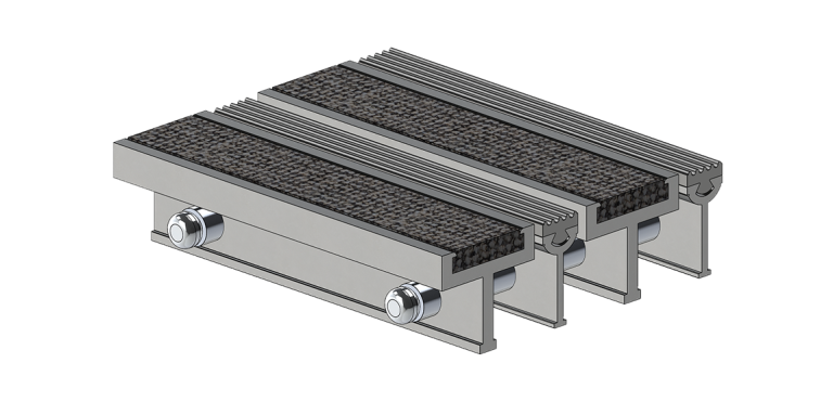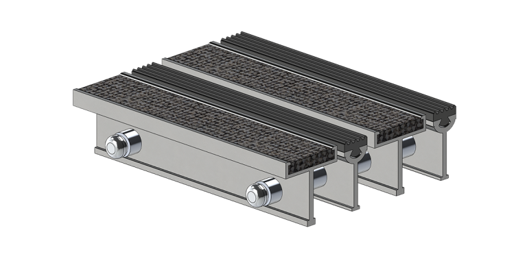 Les lames de la grille sont en aluminium et se présentent avec une insertion de tapis, suivie d’une insertion de vinyle à surface rectiligne. Les bandes de tapis et de vinyle sont insérées de manière à ce qu’elles soient interchangeables et sont conçues spécialement pour allier esthétique et efficacité. Pour maximiser la sécurité, les bandes sont bloquées à chaque extrémité.