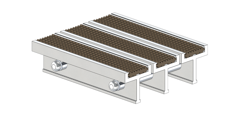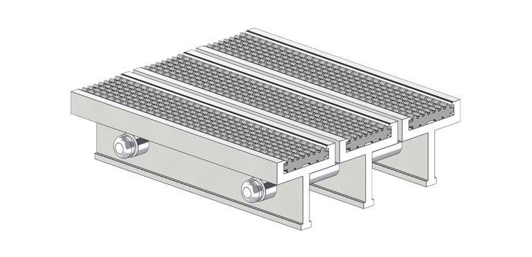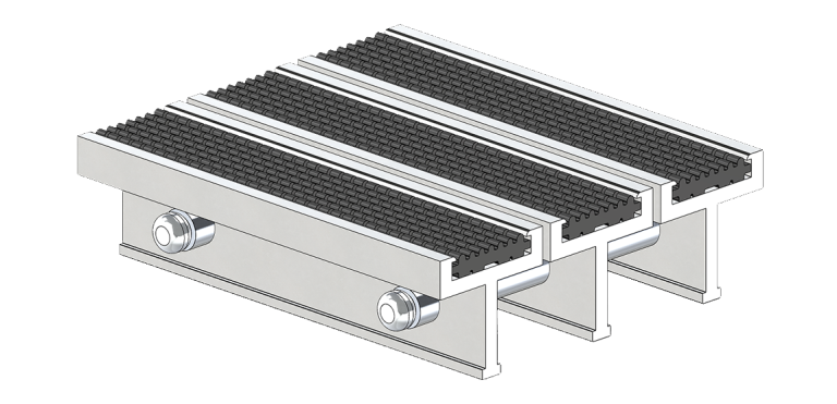 Les lames de la grille sont en aluminium et comportent une insertion de vinyle à surface striée antidérapante. Les insertions de vinyle sont interchangeables et conçues spécialement pour allier esthétique et efficacité. Pour maximiser la sécurité, les bandes sont bloquées à chaque extrémité.