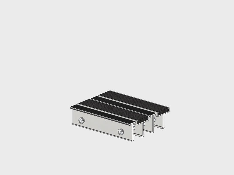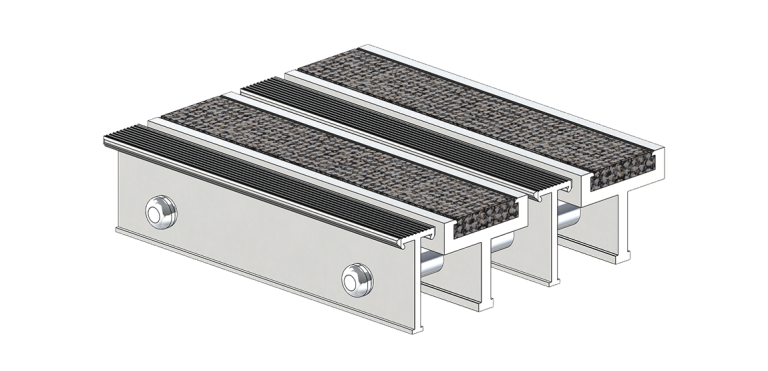 Les lames de la grille sont en aluminium et comportent une insertion de tapis, suivie d’une lame d’aluminium rainurée. Les bandes de tapis sont insérées de manière à ce qu’elles soient interchangeables et sont conçues spécialement pour allier esthétique et efficacité. Pour maximiser la sécurité, les bandes sont bloquées à chaque extrémité.