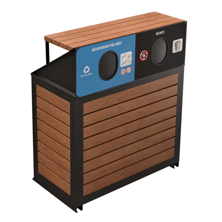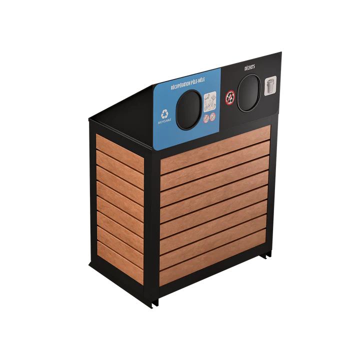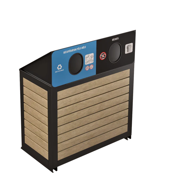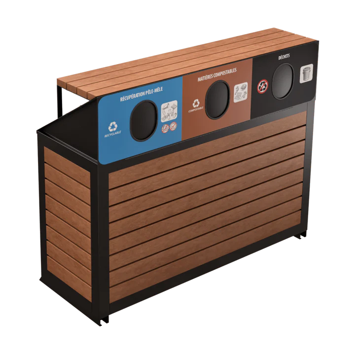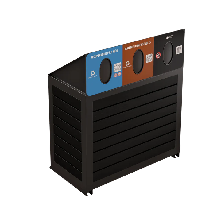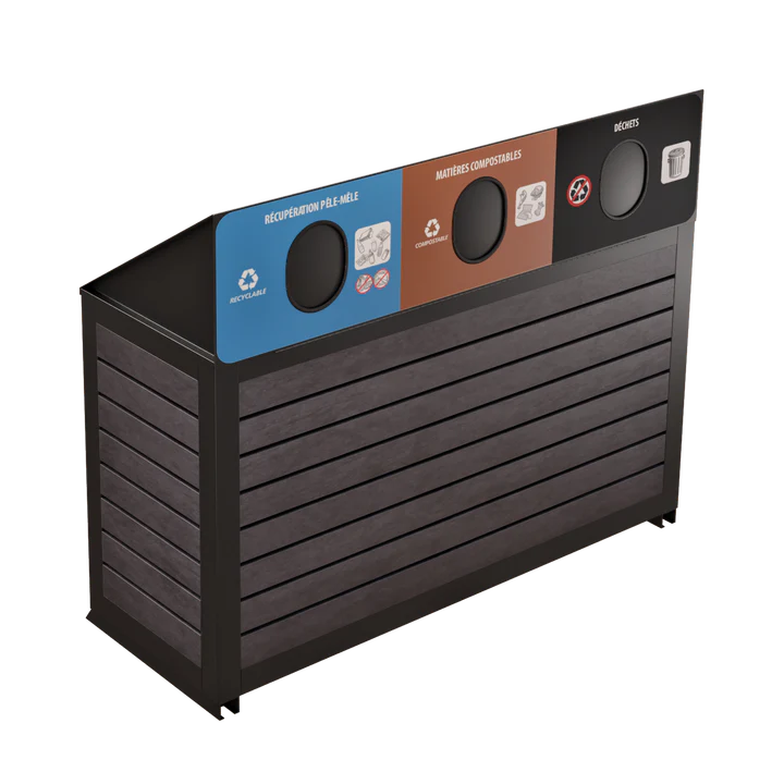 Cette unité multi-matières est destinée à une utilisation extérieure dans les endroits publics achalandés. Elle permet de trier à la source les matières résiduelles dans les lieux publics, tout en limitant la contamination. Le bac est monté sur des pattes afin de dégager le sol.