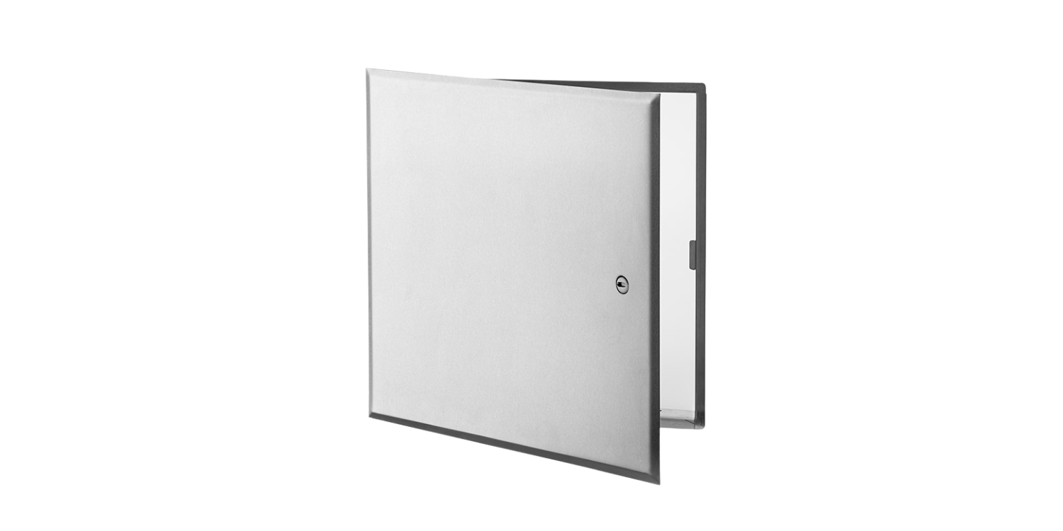 Panneau d’accès à usage universel, en acier inoxydable, avec cadre dissimulé Loquet à tournevis • Charnière de type pantographe • Installation : mur et plafond
