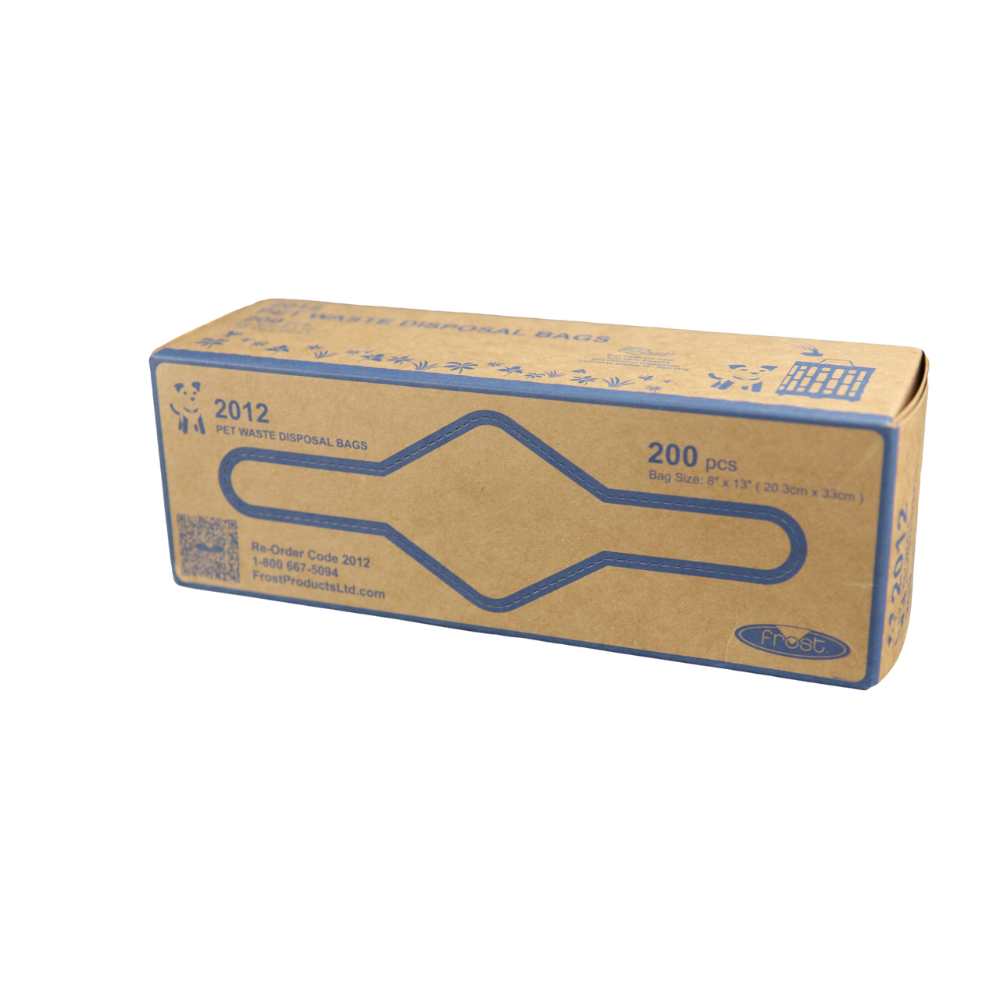 Les sacs à déchets pour animaux de compagnie 2012 sont conçus pour être utilisés avec la station de déchets pour animaux de Frost. Les sacs jetables pour déchets animaux 2012 sont livrés dans une caisse de dix boîtes. Chaque boîte comprend 200 sacs. Deux boîtes de sacs jetables s'insèrent dans le distributeur de déchets pour animaux Frost 2010. Ces sacs sont faciles à retirer du distributeur et mesurent 20,3 cm x 33 cm (8" x 13").