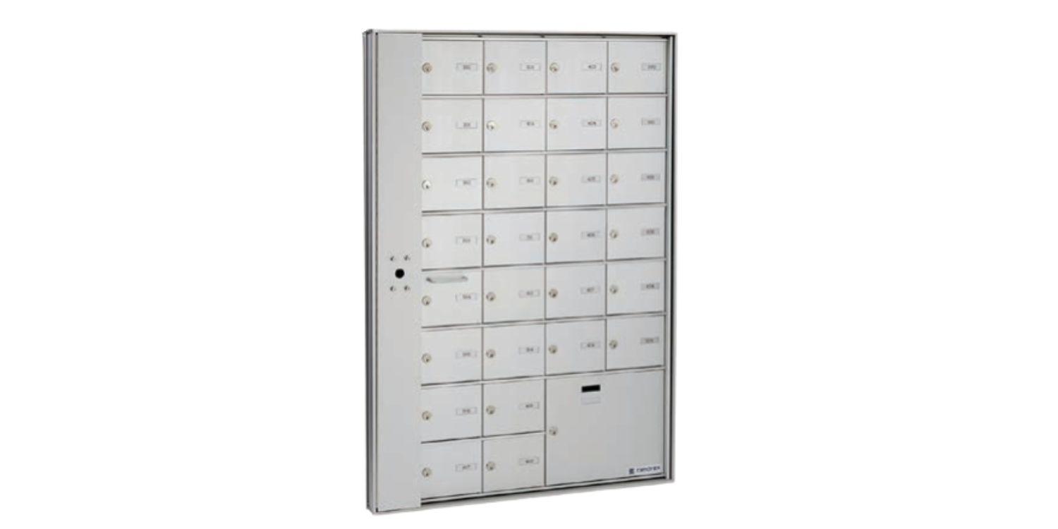 Boîte aux lettres horizontale à accès par l’avant, modèle mural de surface Panneau de verrouillage • Boîte à colis • Satisfait aux exigences des normes de Postes Canada ou les dépasse • Pour l’intérieur
