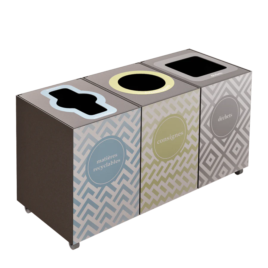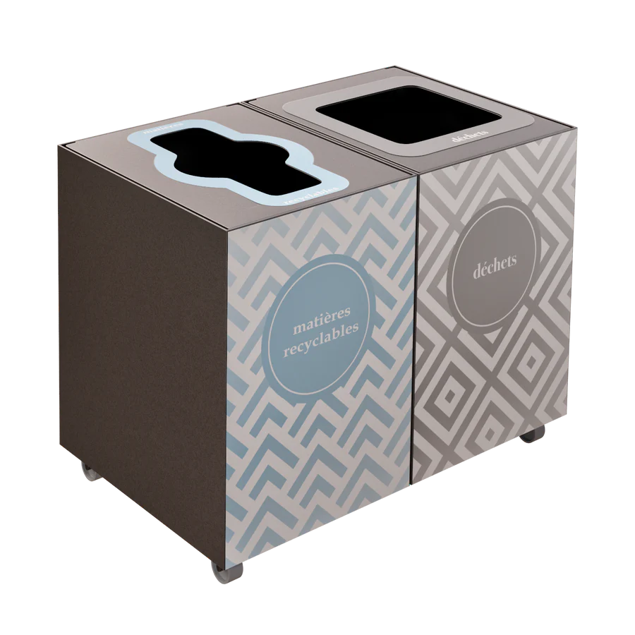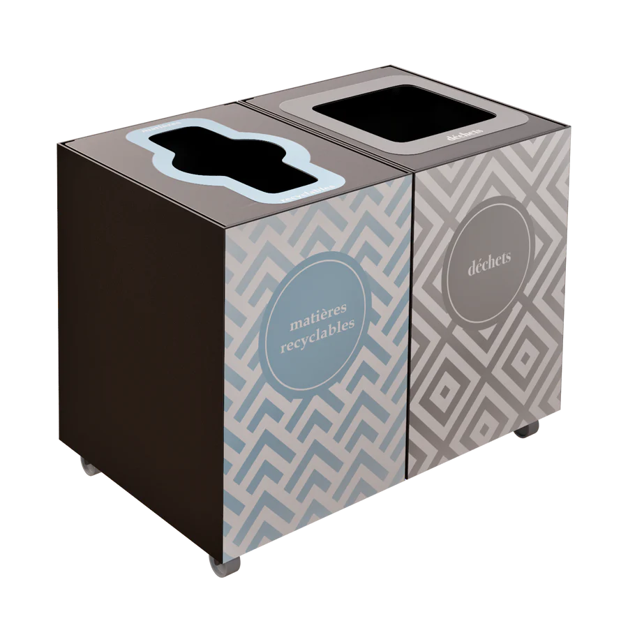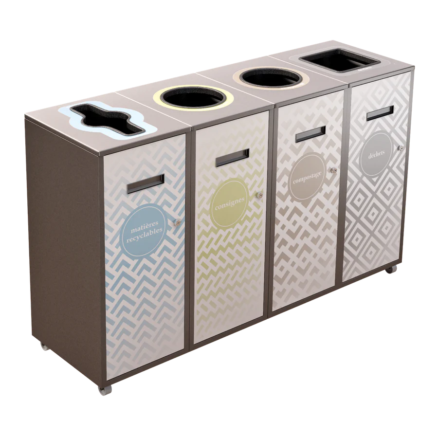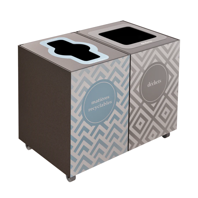MATÉRIAU – Les modules sont fabriqués en tôle d’acier avec 50 % de contenu recyclé et recyclable en fin de vie. La tôle est finie à la peinture électrostatique (peinture cuite) pour une grande durabilité. Le bac utilise de la tôle de calibre 18, sauf le fond qui est de calibre 14. Des doublures en plastique de 26 litres (6.9 gal US) sont insérées à l’intérieur de chacun des compartiments. Des sacs de 22″ x 24″ peuvent être utilisés à l’intérieur de chacune des doublures. Les doublures, qui possèdent un rebord à leur sommet, sont fabriquées en plastique avec 35 % de contenu recyclé. Leur insertion adéquate dans le compartiment est facilitée par deux guides fixés au fond.