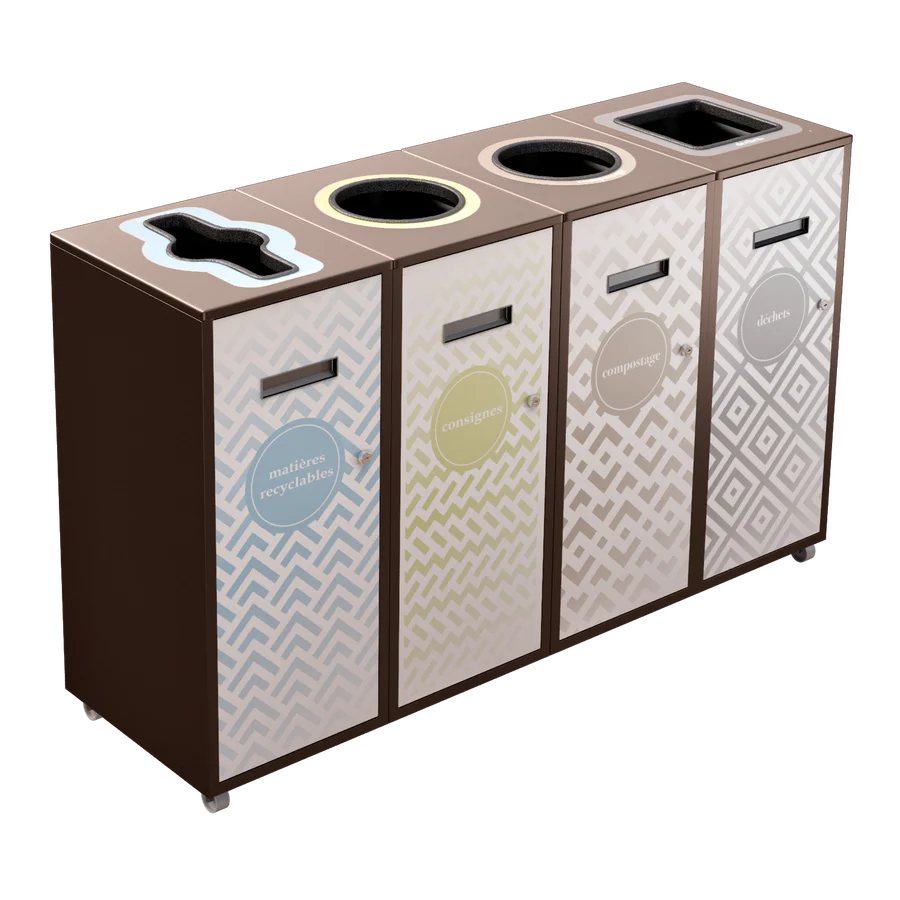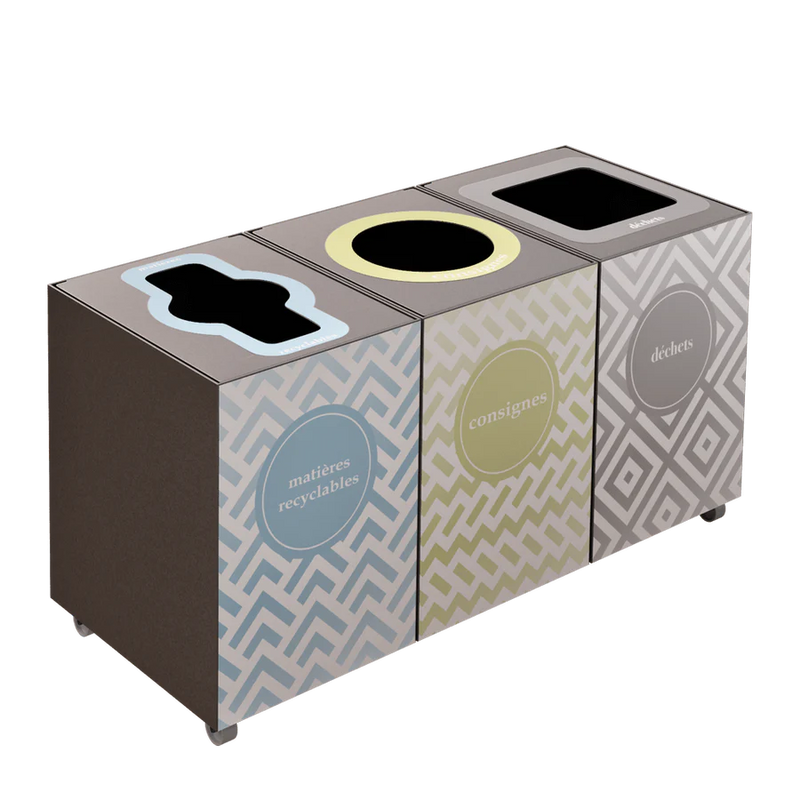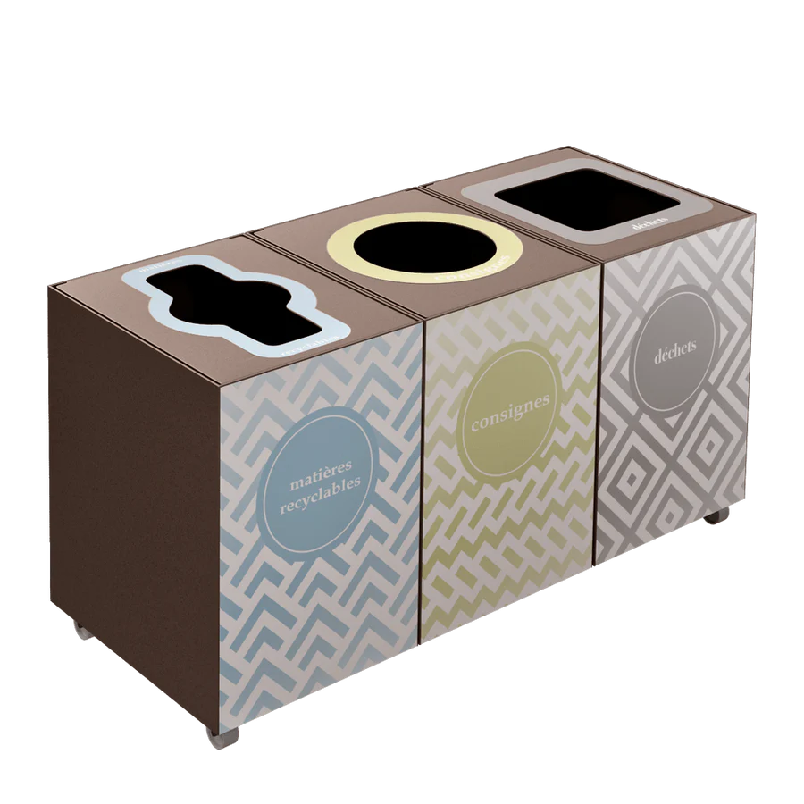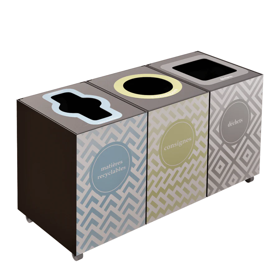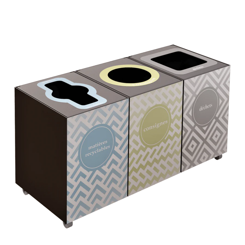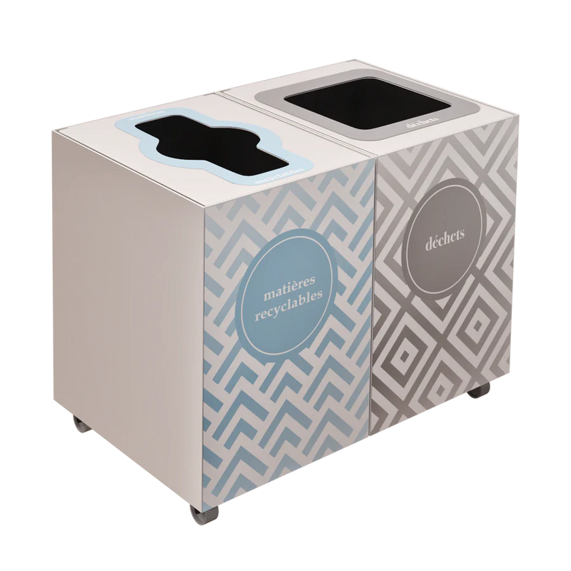 MATÉRIAU – Les modules sont fabriqués en tôle d’acier avec 50 % de contenu recyclé et recyclable en fin de vie. La tôle est finie à la peinture électrostatique (peinture cuite) pour une grande durabilité. Le bac utilise de la tôle de calibre 18, sauf le fond qui est de calibre 14. Des doublures en plastique de 26 litres (6.9 gal US) sont insérées à l’intérieur de chacun des compartiments. Des sacs de 22″ x 24″ peuvent être utilisés à l’intérieur de chacune des doublures. Les doublures, qui possèdent un rebord à leur sommet, sont fabriquées en plastique avec 35 % de contenu recyclé. Leur insertion adéquate dans le compartiment est facilitée par deux guides fixés au fond.