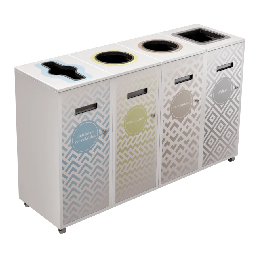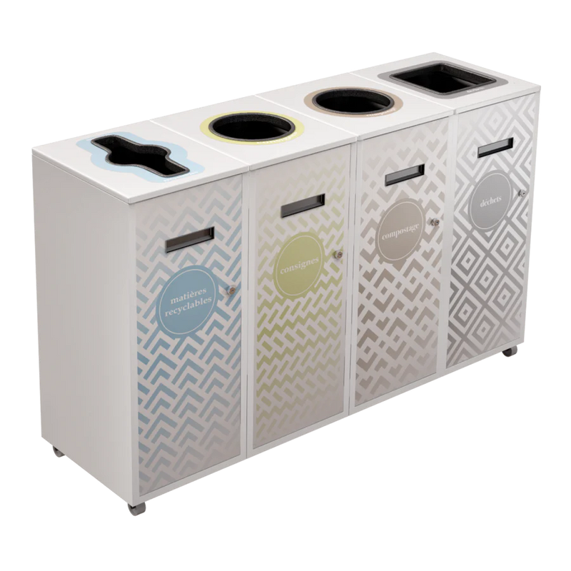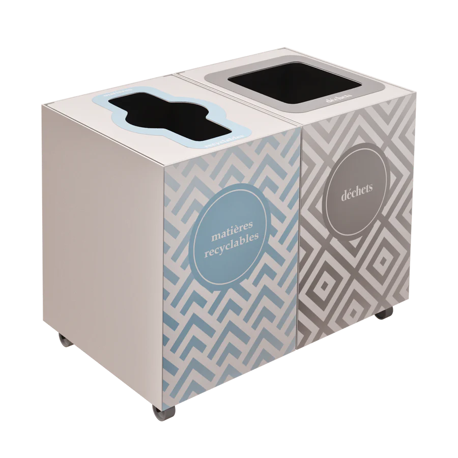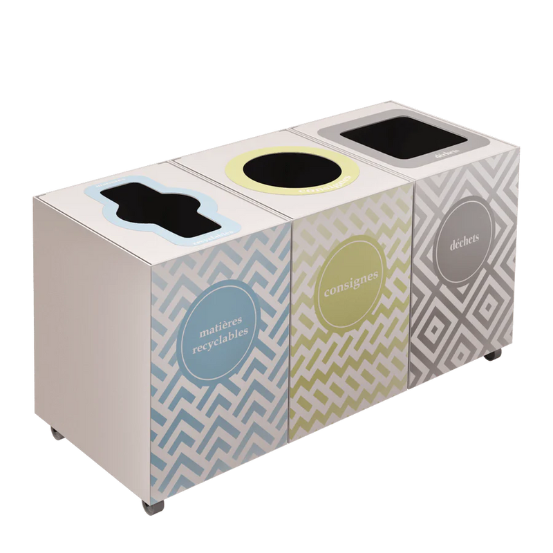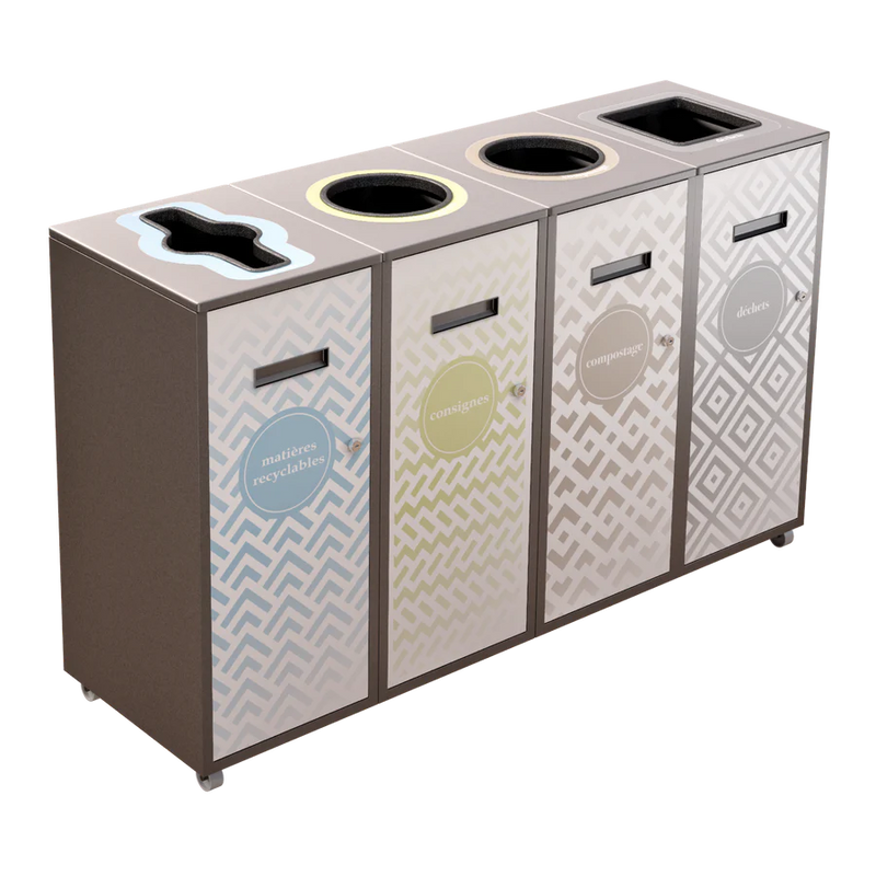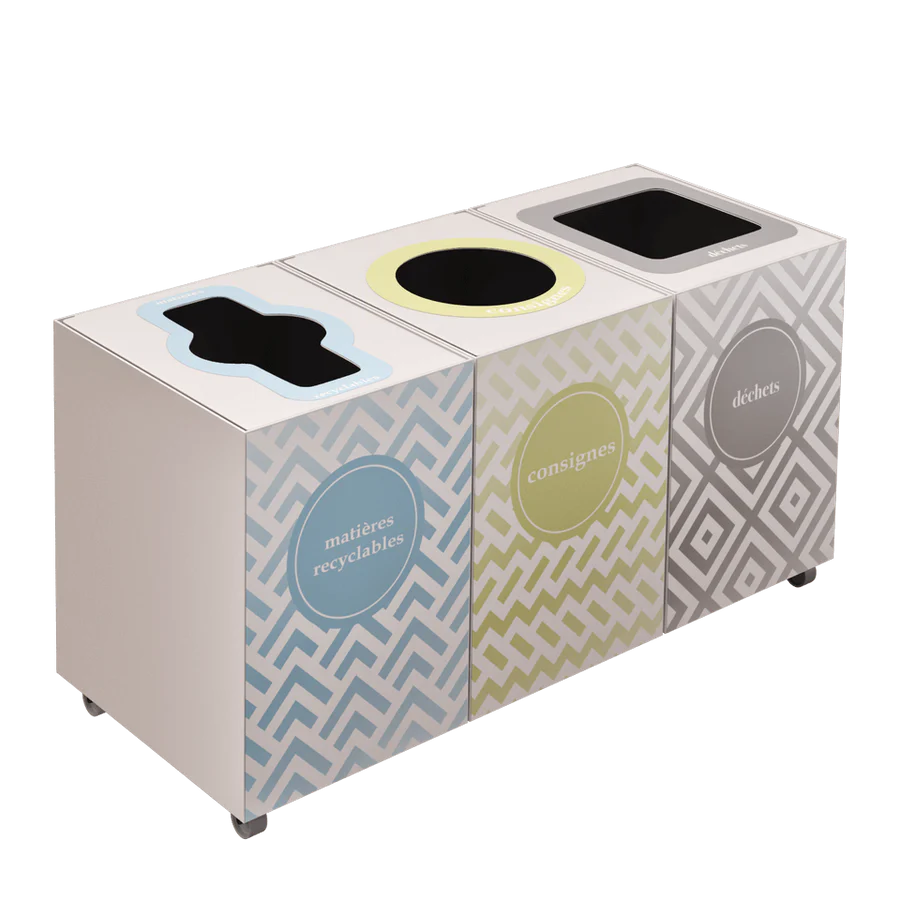 MATÉRIAU – Les modules sont fabriqués en tôle d’acier avec 50 % de contenu recyclé et recyclable en fin de vie. La tôle est finie à la peinture électrostatique (peinture cuite) pour une grande durabilité. Le bac utilise de la tôle de calibre 18, sauf le fond qui est de calibre 14. Des doublures en plastique de 26 litres (6.9 gal US) sont insérées à l’intérieur de chacun des compartiments. Des sacs de 22″ x 24″ peuvent être utilisés à l’intérieur de chacune des doublures. Les doublures, qui possèdent un rebord à leur sommet, sont fabriquées en plastique avec 35 % de contenu recyclé. Leur insertion adéquate dans le compartiment est facilitée par deux guides fixés au fond.