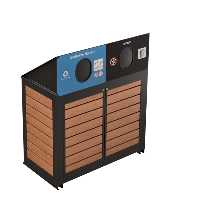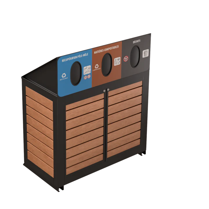 Cet îlot extérieur multi-matières est destiné à une utilisation dans les endroits publics achalandés. Elle permet de trier à la source les matières résiduelles dans les lieux publics, tout en limitant la contamination.