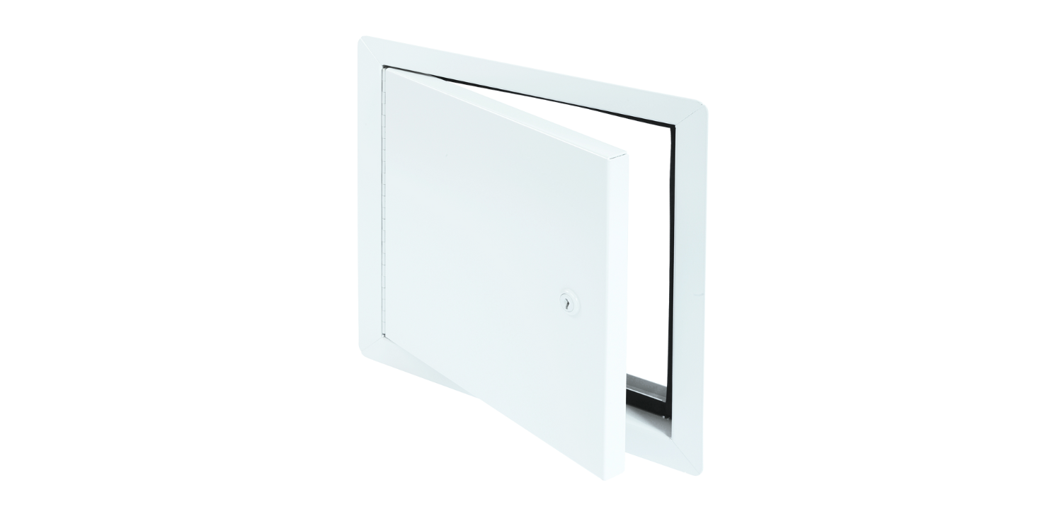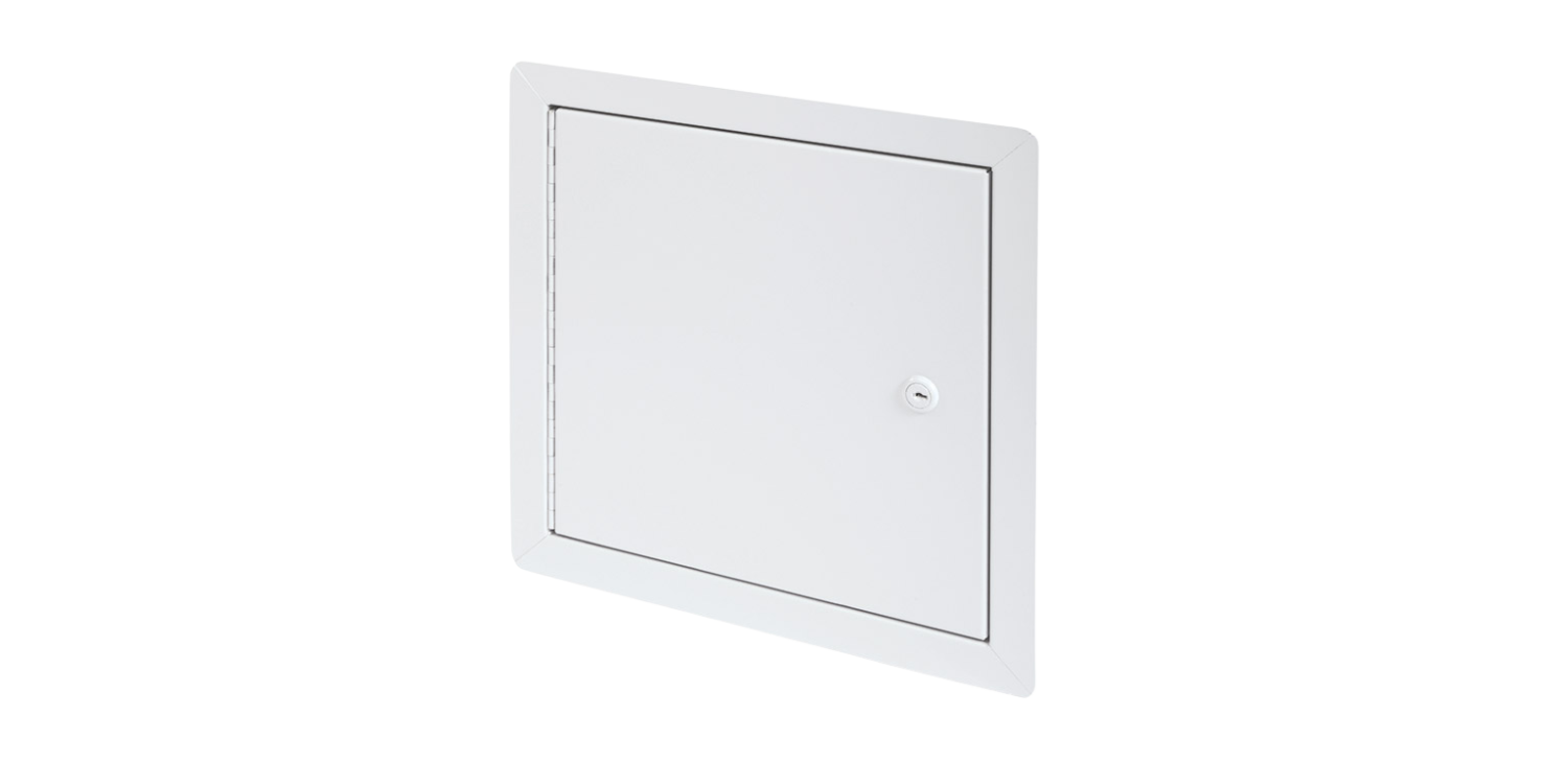 Panneau d’accès à usage universel isolé en aluminium, avec cadre apparent Barillet à clé • Penture piano en aluminium • Installation : mur et plafond