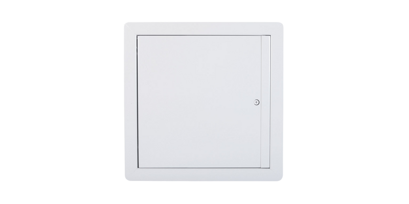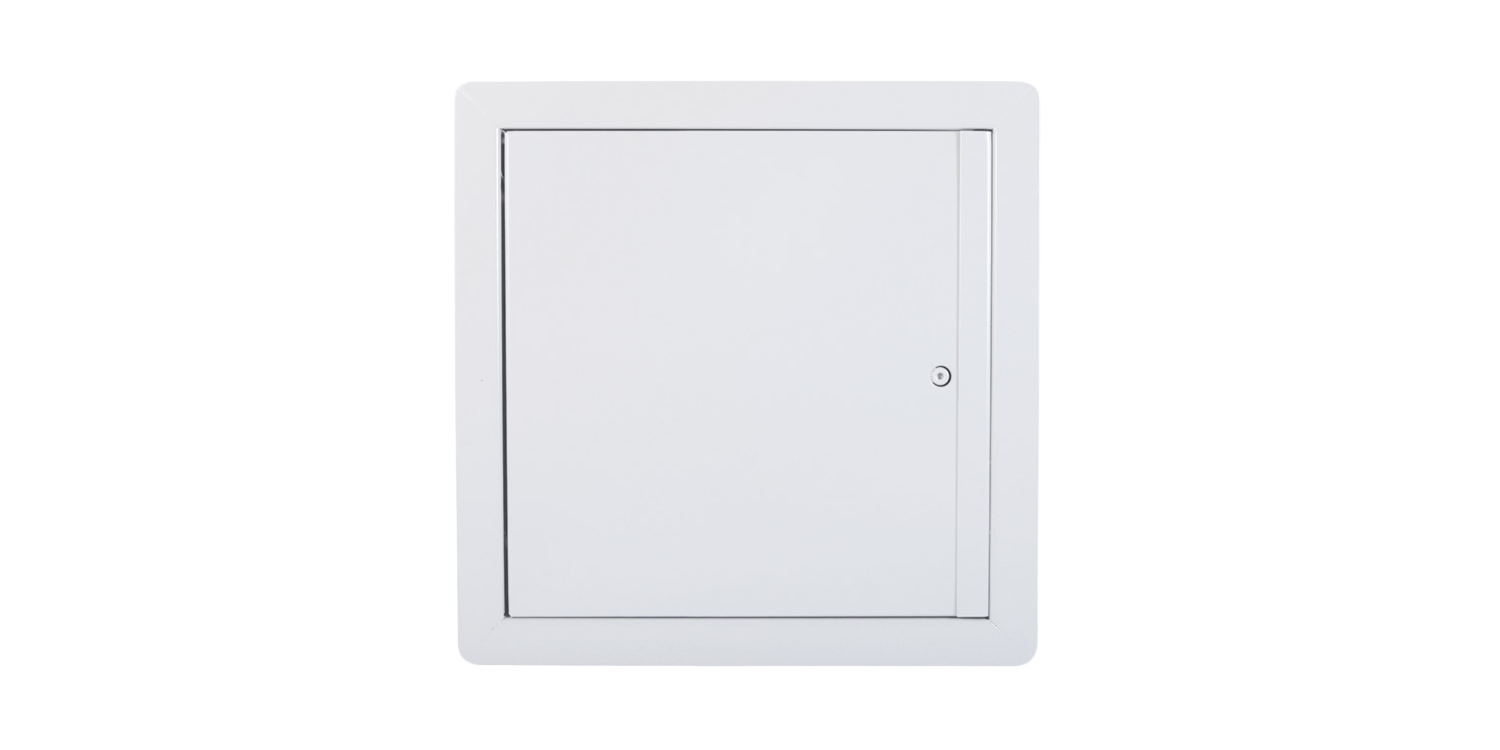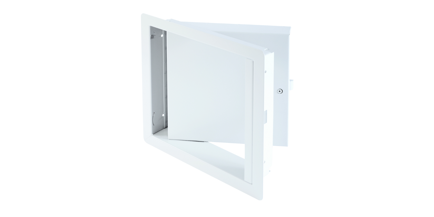 Panneau d’accès isolé, homologué contre le feu, à ouverture ascendante, avec cadre apparent , Loquet à enclenchement automatique à tête hexagonale et loquet à enclenchement automatique avec clé-outil • Penture piano • Installation : plafond