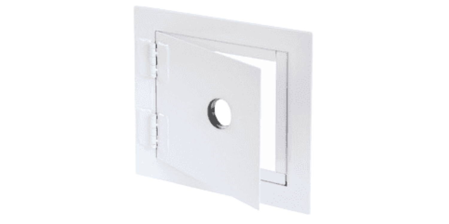 Panneau d’accès à usage universel, à haute sécurité, avec cadre apparent Mortaise à serrure à pêne dormant • Charnière robuste de type carré • Installation : mur et plafond
