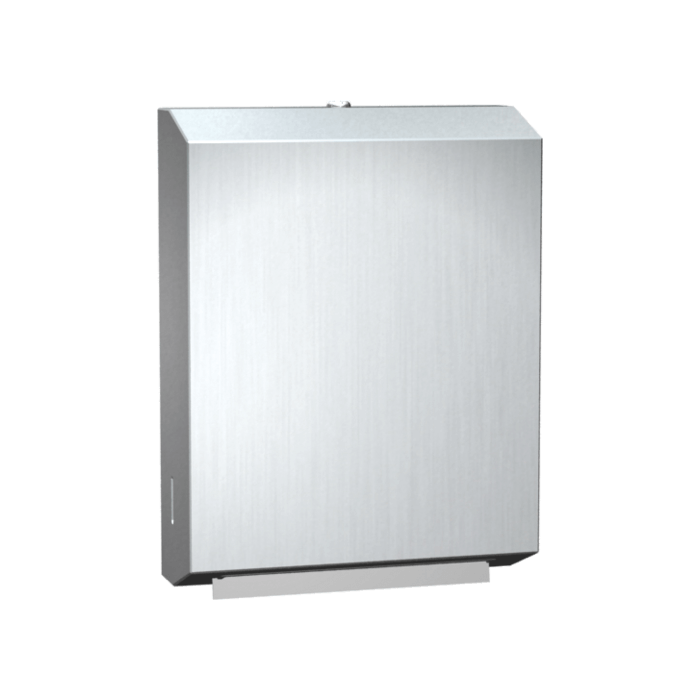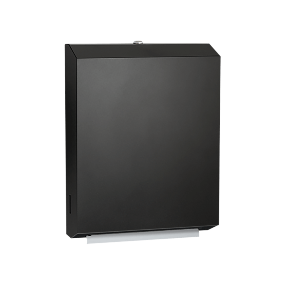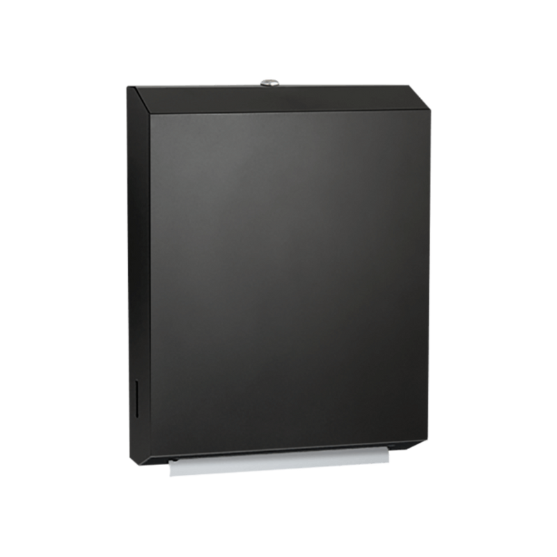 Fabriqué en acier inoxydable de calibre 22 avec une finition satinée ou noir mat, cet appareil permet de distribuer 400 serviettes en papier à plis en C ou 525 serviettes en papier à plis multiples sans réglage ni adaptateur. Il est équipé d'une serrure à gorges et d'une charnière piano en acier inoxydable très résistante.