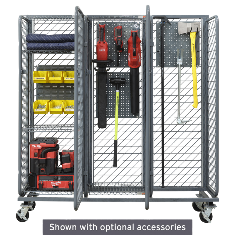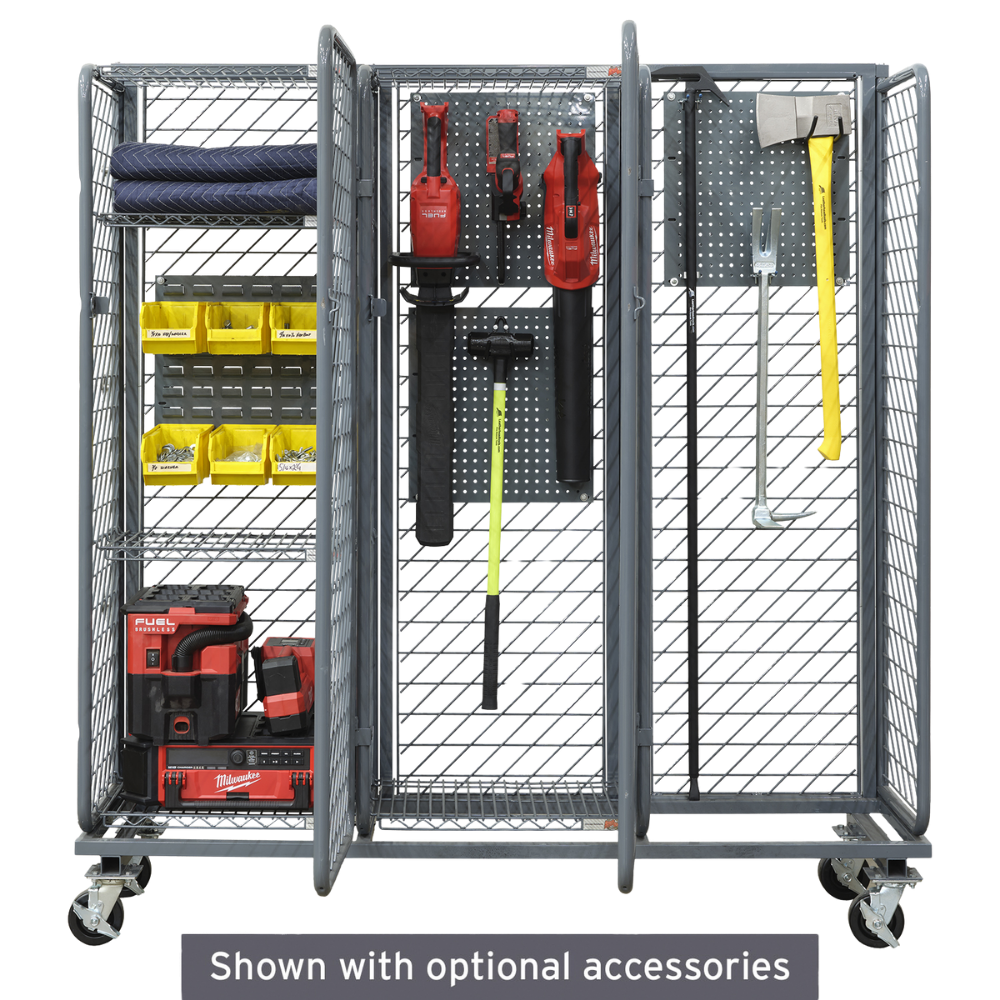 Maintenant vous pouvez stocker tous vos outils, accessoires, et autres petits articles en un endroit sûr et sécurisé. Conçu avec une construction robuste en acier soudé et recouvert de peinture poudrée, ce système lourd combine durabilité et sécurité avec fonctionnalité et organisation. Notre système de casiers peu encombrant est disponible comme système mobile avec soit deux ou trois casiers individuels, ou comme système mural et peut être arrangé avec n’importe quelle quantité de casiers individuels. Chaque casier individuel mesure 20″ de profondeur x 24″ de largeur x 72″ de hauteur et vient standard avec trois niveaux d’étagères et un panneau de sécurité arrière. Personnalisez votre système en utilisant des étagères supplémentaires, des panneaux métalliques perforés et panneaux métalliques à persiennes, ainsi qu’une porte de sécurité et une étagère sécurisée. Vraiment la seule solution de rangement pour outils dont vous aurez jamais besoin.