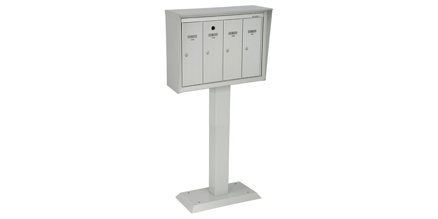 Boîte aux lettres verticale à panneau frontal basculant Modèle sur piédestal • Satisfait aux exigences des normes de Postes Canada ou les dépasse • Pour l’extérieur